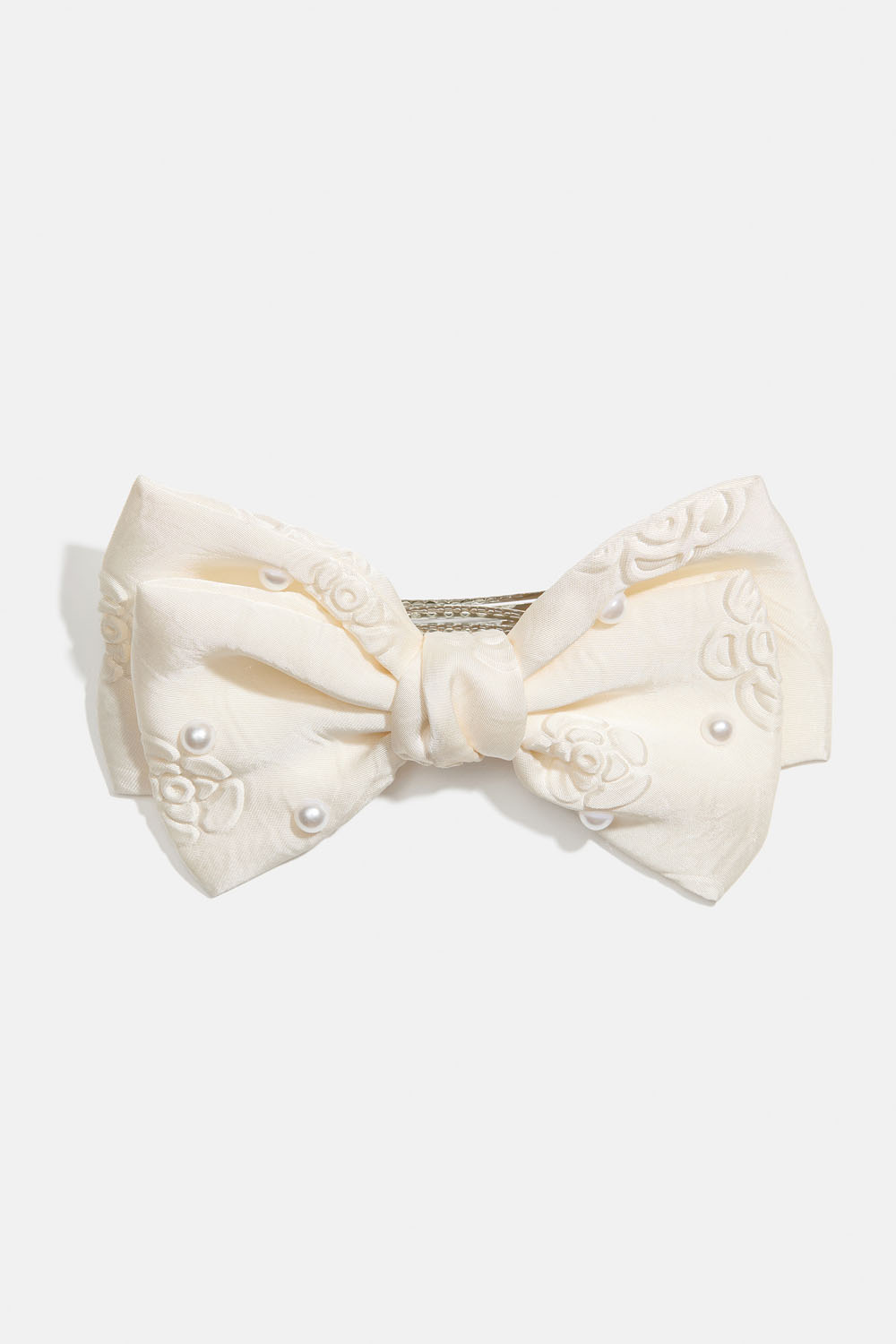 Hårspænde med hvid dobbelt sløjfe i blankt stof med prægede roser og hvide perler.
