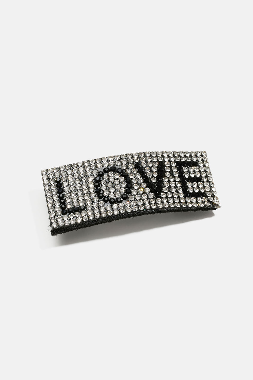 Flad hårspænde dekoreret med LOVE i sorte og hvide glassten.