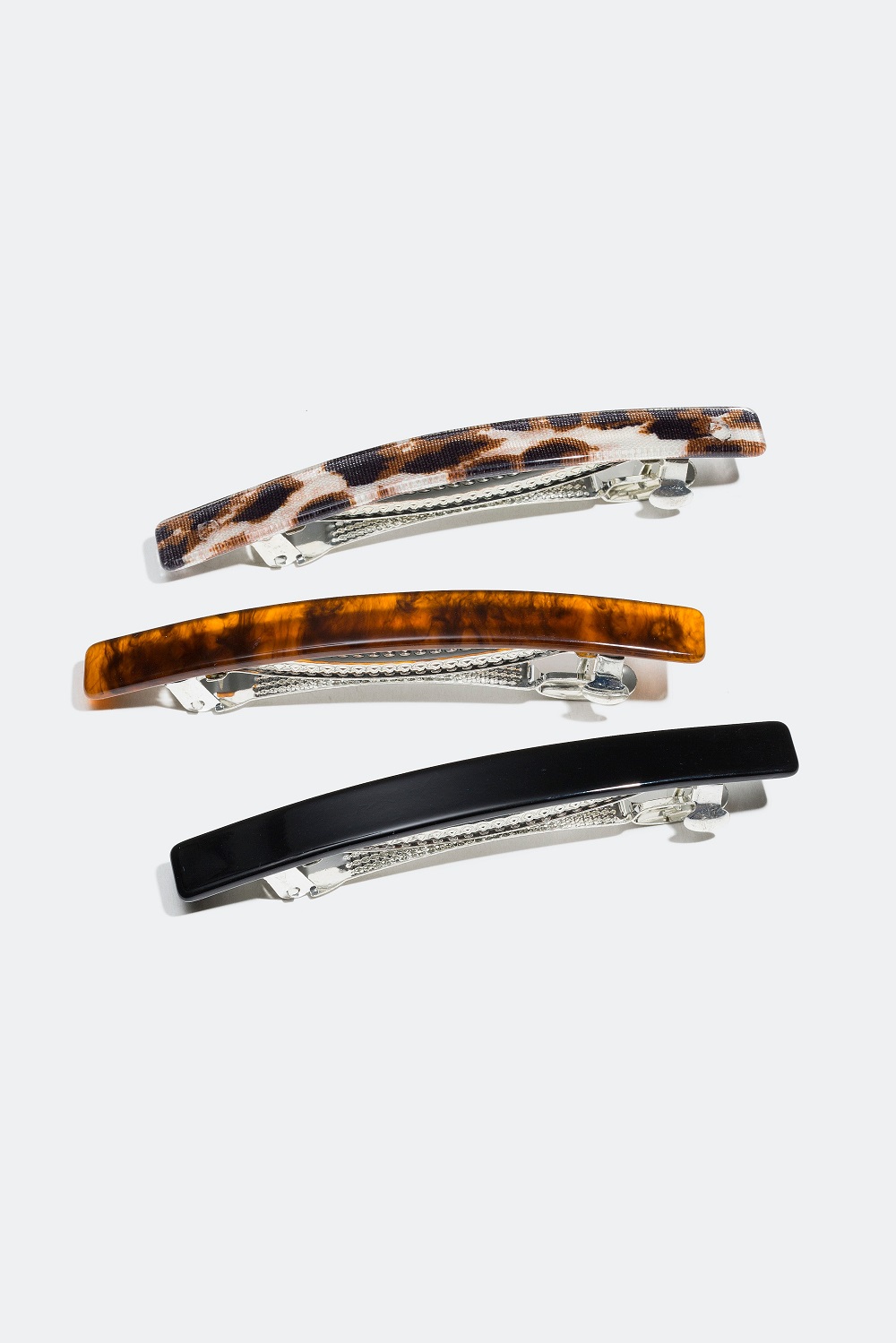Tre hårspænder med blank overflade: to med et meleret mønster, det ene i brun- og sortmeleret og det andet i brunt, sort og hvidt leopardmønster, og det tredje i sort.