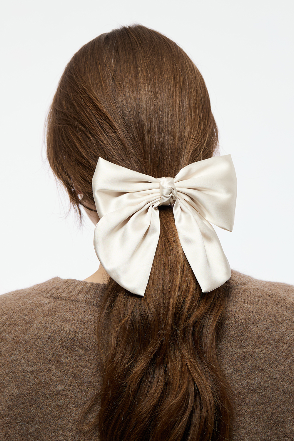 Hårspænde i metal med sløjfe i skinnende stof og knude i midten.