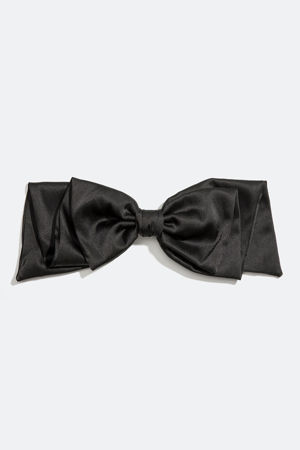 Hårspænde med stor sløjfe i sort imiteret silke. Et dekorativt hårtilbehør med skinnende stof, der giver din frisure en flot detalje. Dette er det perfekte hårtilbehør til alle sæsonens begivenheder.
