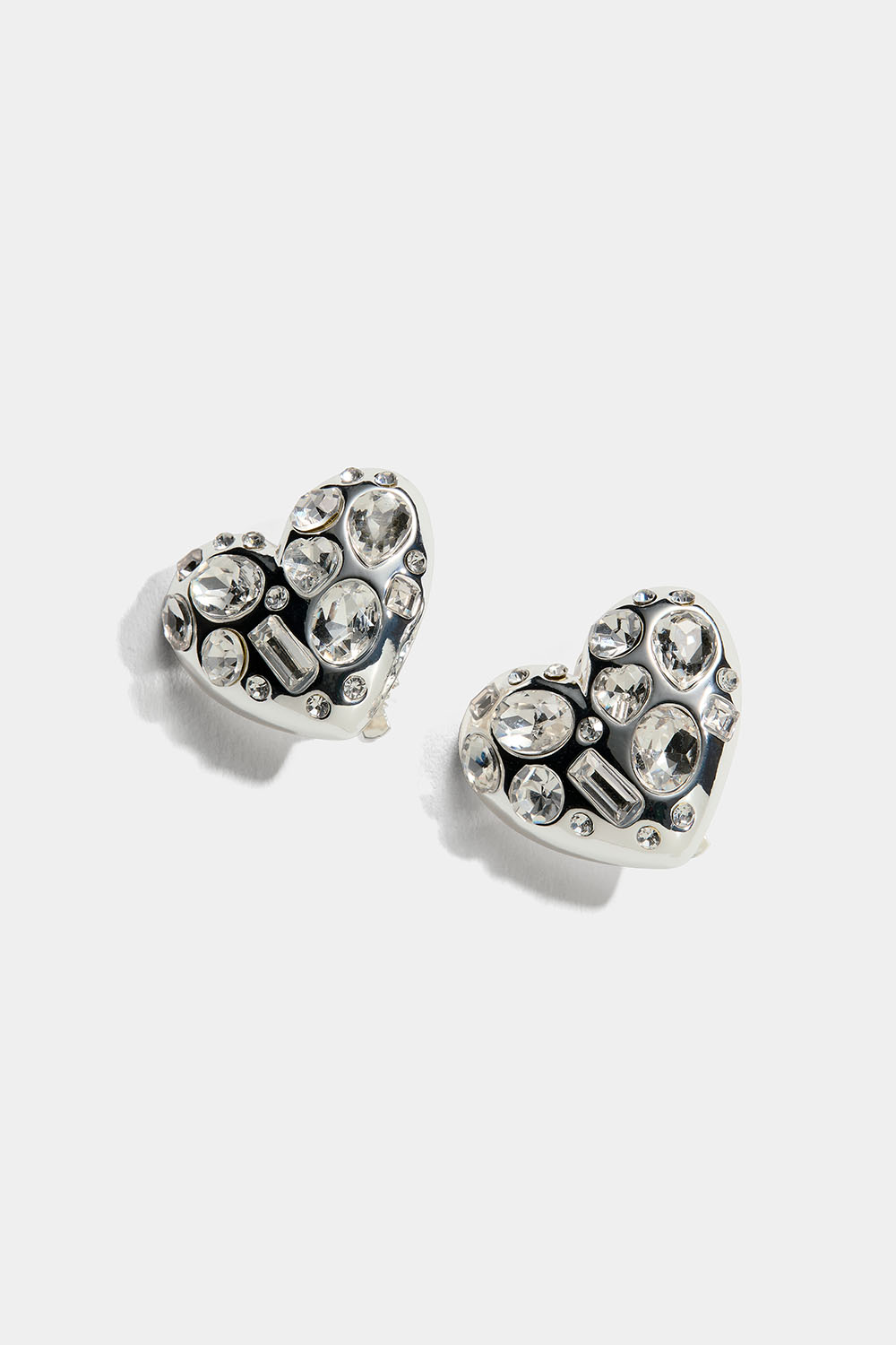 Hjerteformede klipsøreringe i sølvfarvet metal dekoreret med hvide glassten i forskellige former.