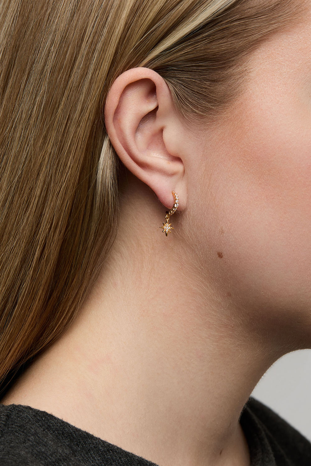 Små hoops i 18k guldbelagt ægte sølv dekoreret med sten i kubisk zirkonia i forskellige størrelser og hængende stjerner.