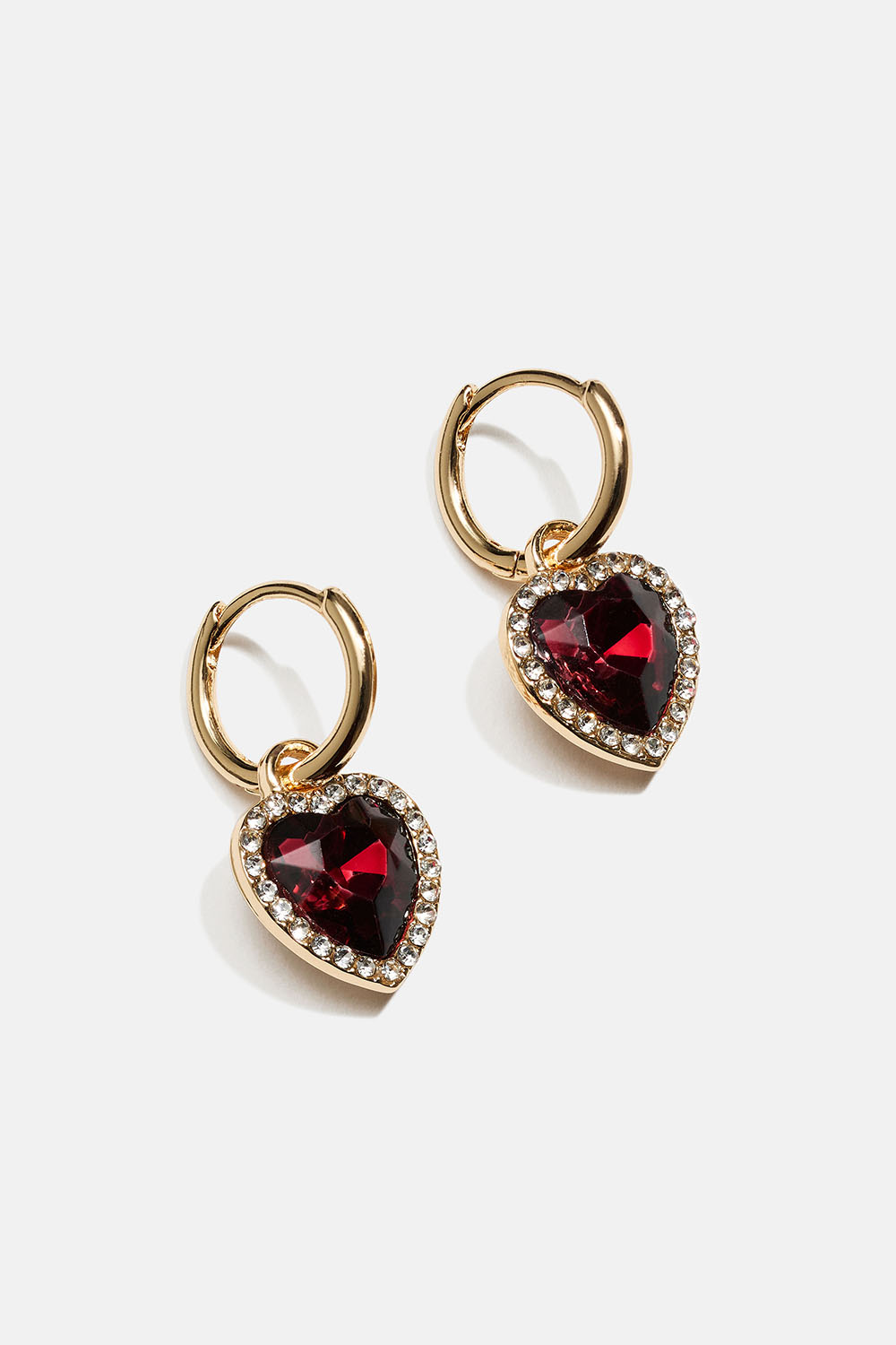 Hoops i guldfarvet metal med hængende bordeaux hjerteformede glassten med rhinsten rundt om.