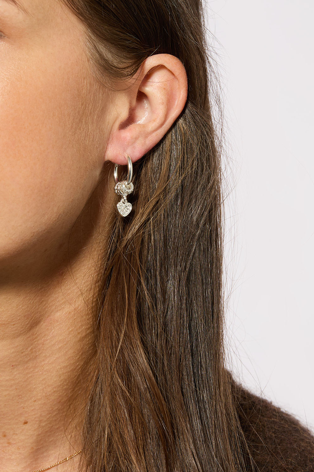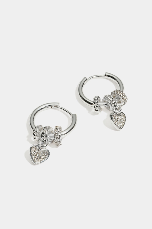 Klassiske hoops i sølvfarvet metal med tre runde charms, den ene med et hængende hjerte.