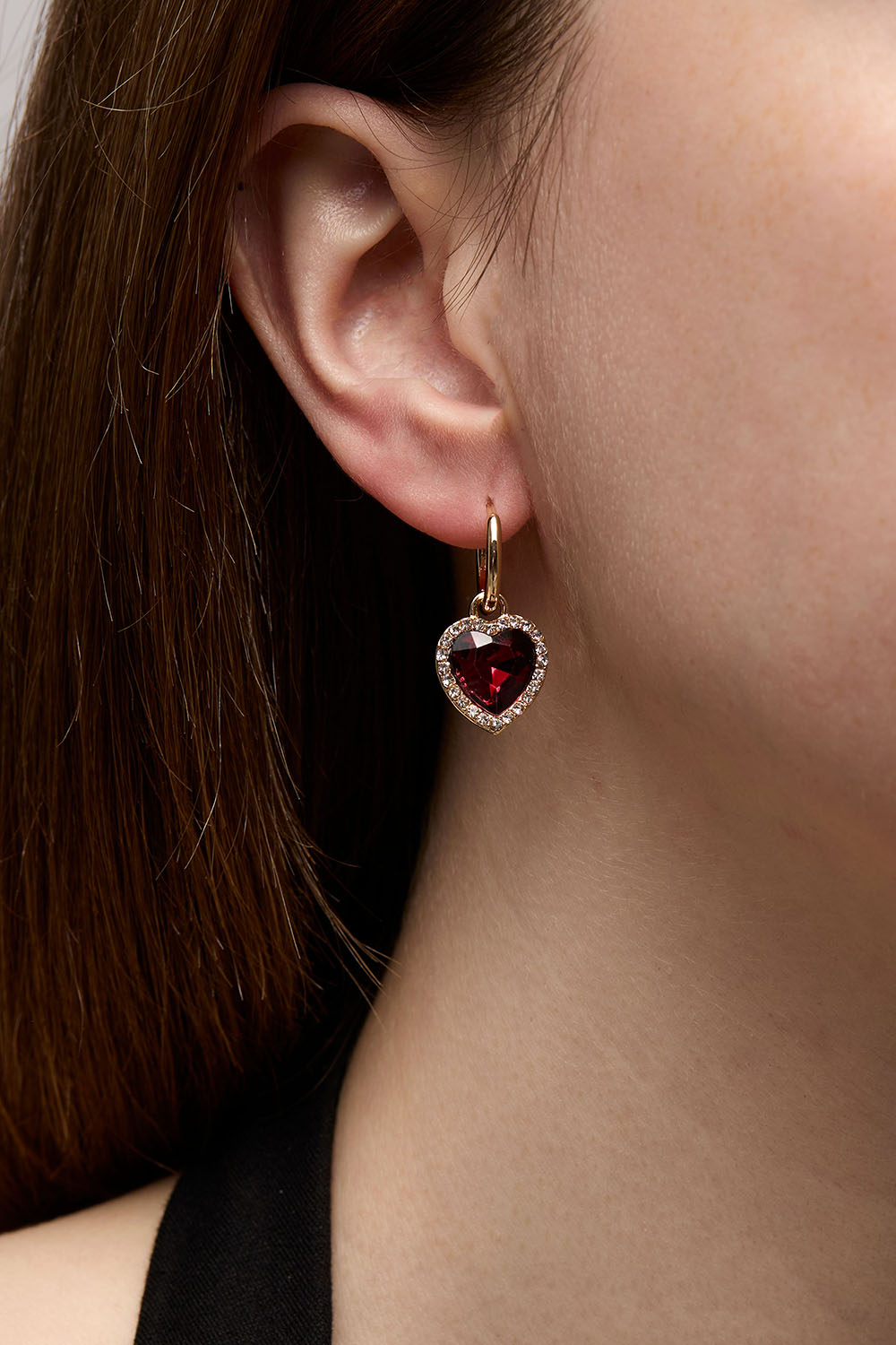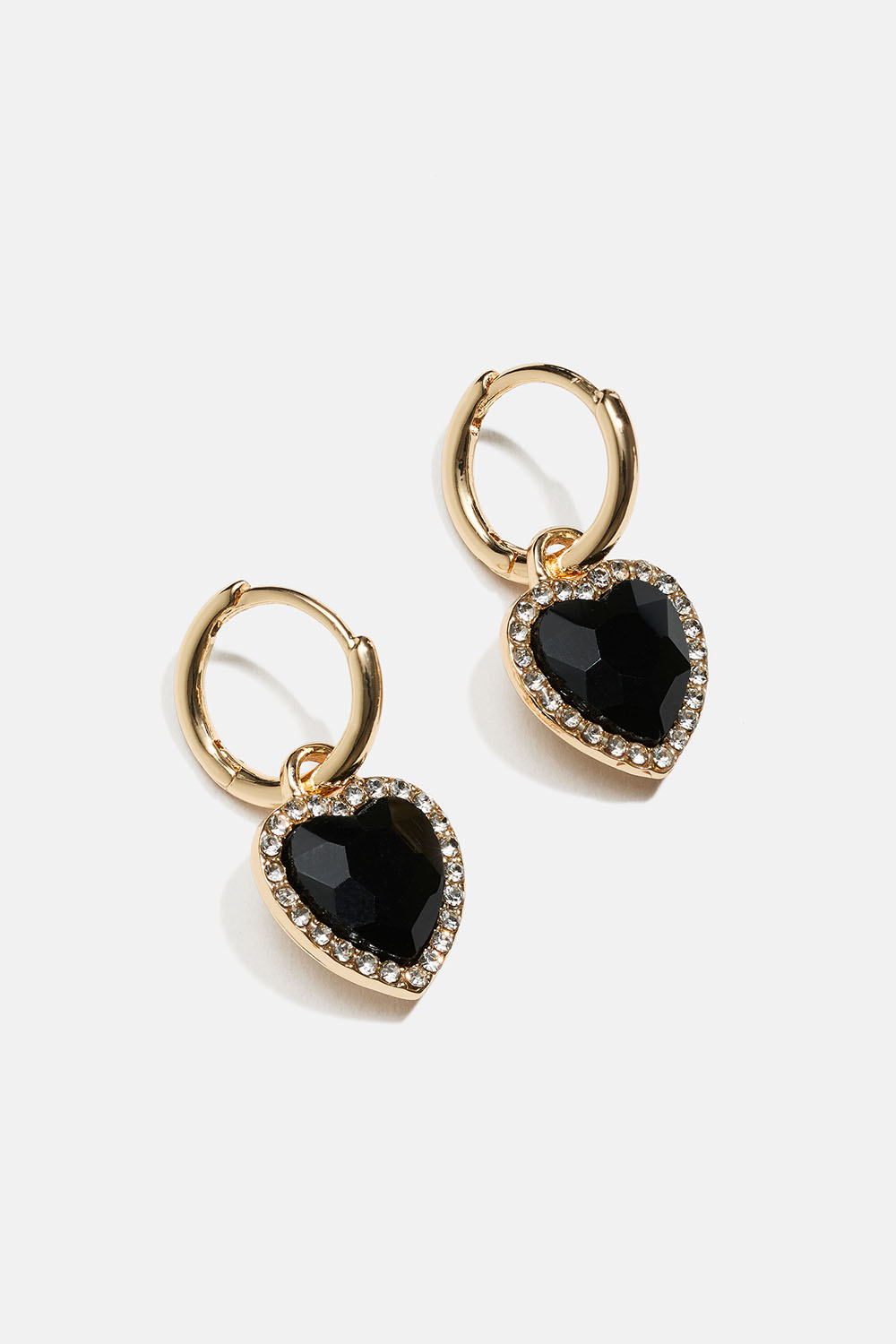 Hoops i guldfarvet metal med hængende sorte hjerteformede glassten med rhinsten rundt om.