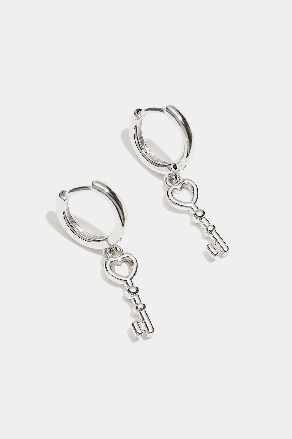 Små hoops i sølvfarvet metal med en hængende hjerteformet nøgle.