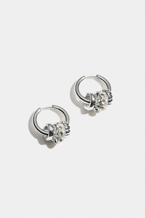 Hoops i metal med tre runde dekorative vedhæng. Øreringene kommer med en glat, en ribbet og en glitrende glassten.