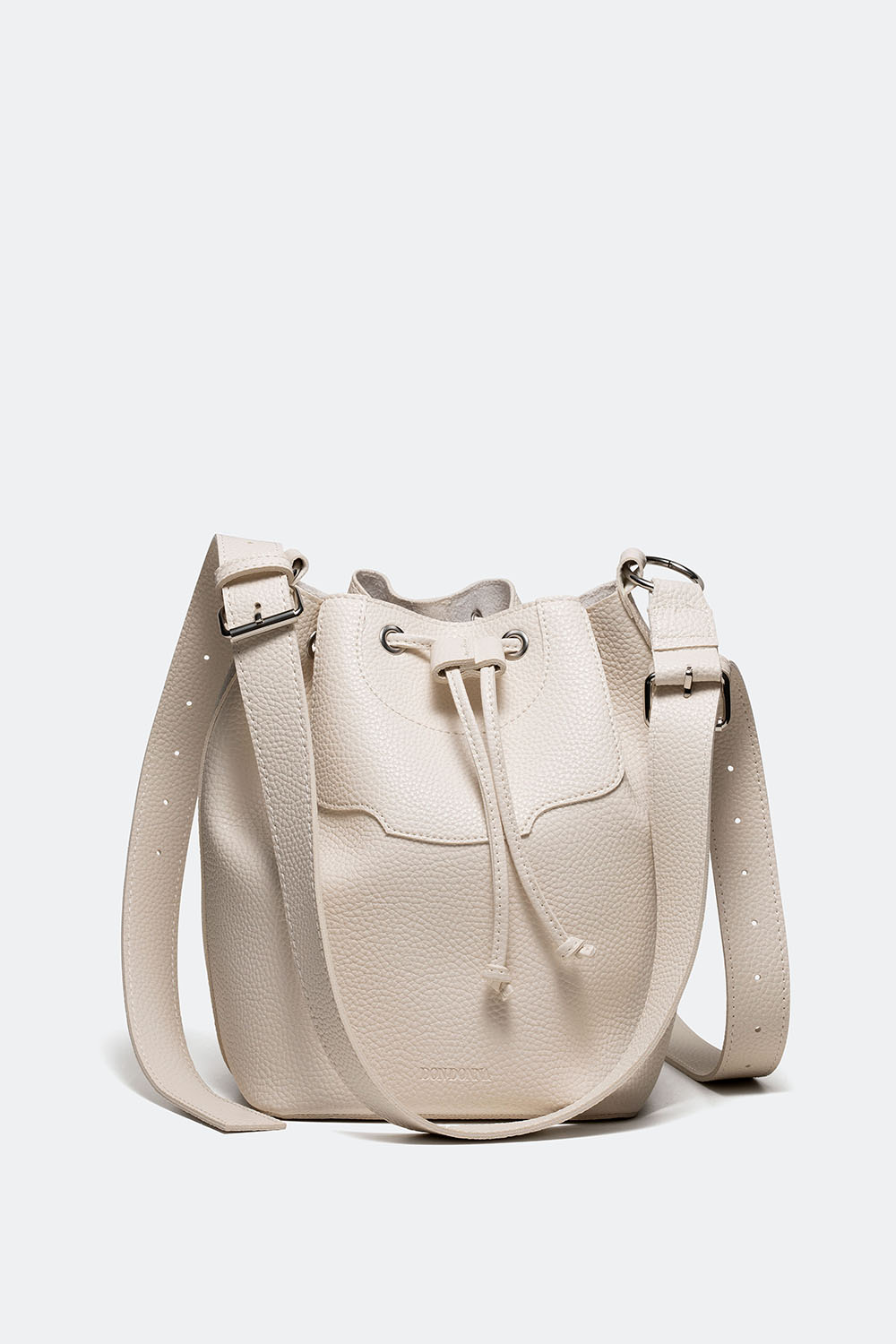 Hvid taske i bucket bag-design med Don Donna-logoet præget foran. Stor taske, der kombinerer mode med funktion og har et stort rum og et mindre rum foran, der lukkes med en magnetisk knap. Leveres med justerbar skulderrem.