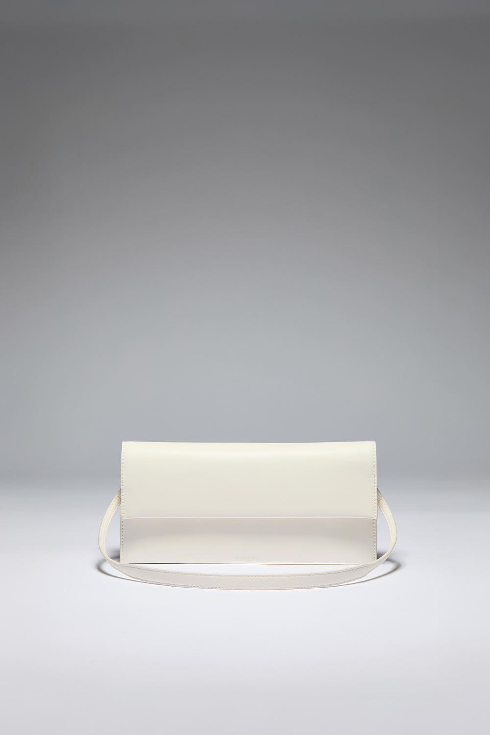 Hvid clutch i imiteret læder med præget lille Don Donna-logo. Tasken lukkes med magnet og har tre rum indeni, som lukkes med lynlås. Der medfølger en aftagelig skulderrem.