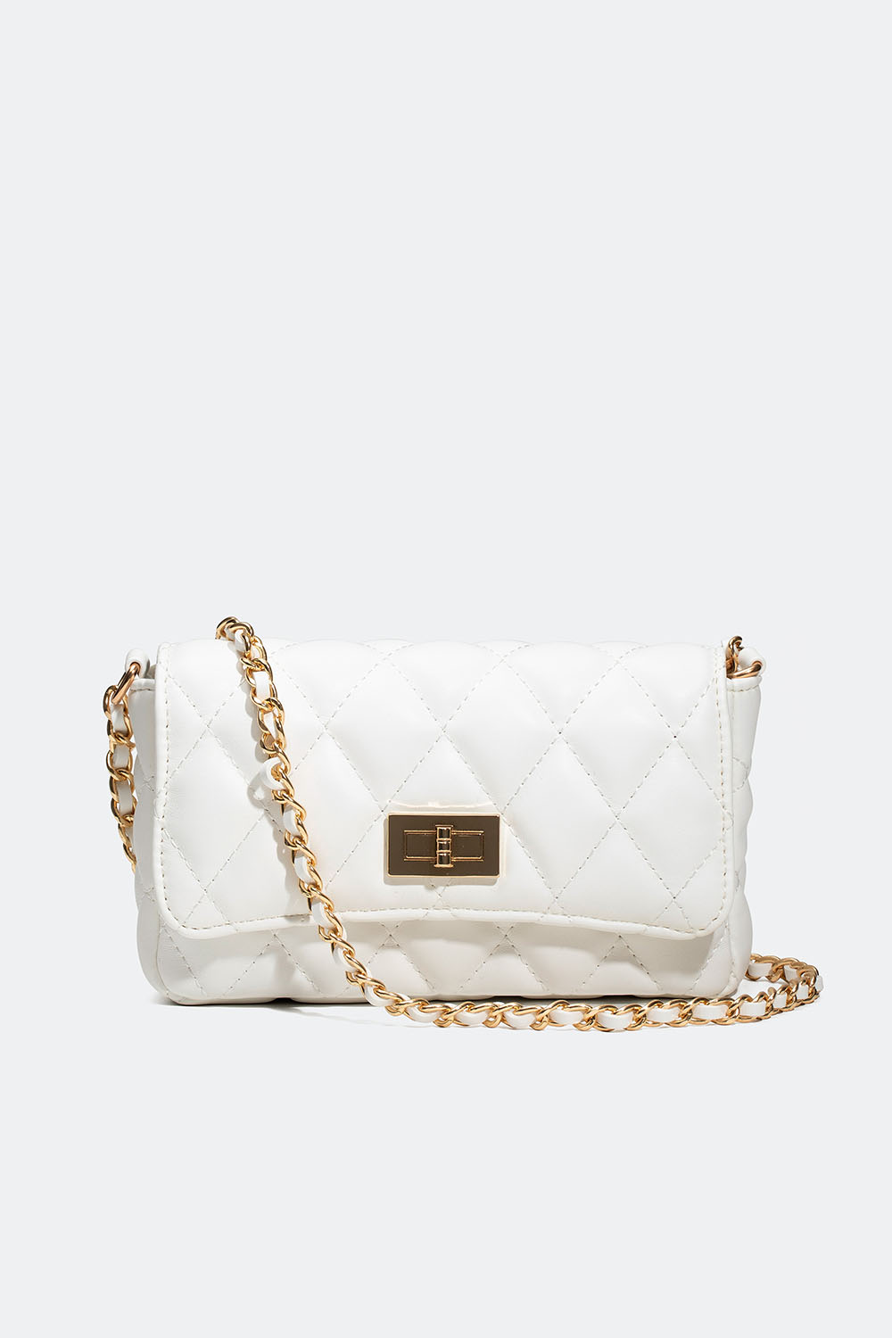 Lille skuldertaske i rektangulært design med hvid quiltet kunstlæder, der også kan bæres som crossbodytaske. En stilfuld taske med en gylden skulderrem dekoreret med hvidt kunstlæder. Den lukkes med et magnetisk spænde, og der er også et mindre rum indeni.