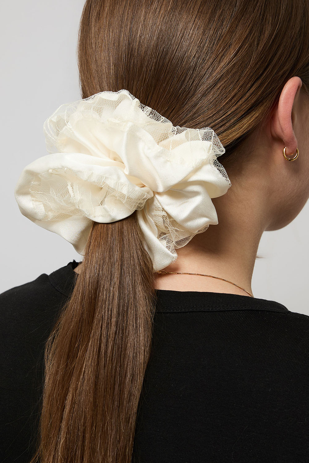 Stor sort scrunchie i imiteret silke med blondedetalje.