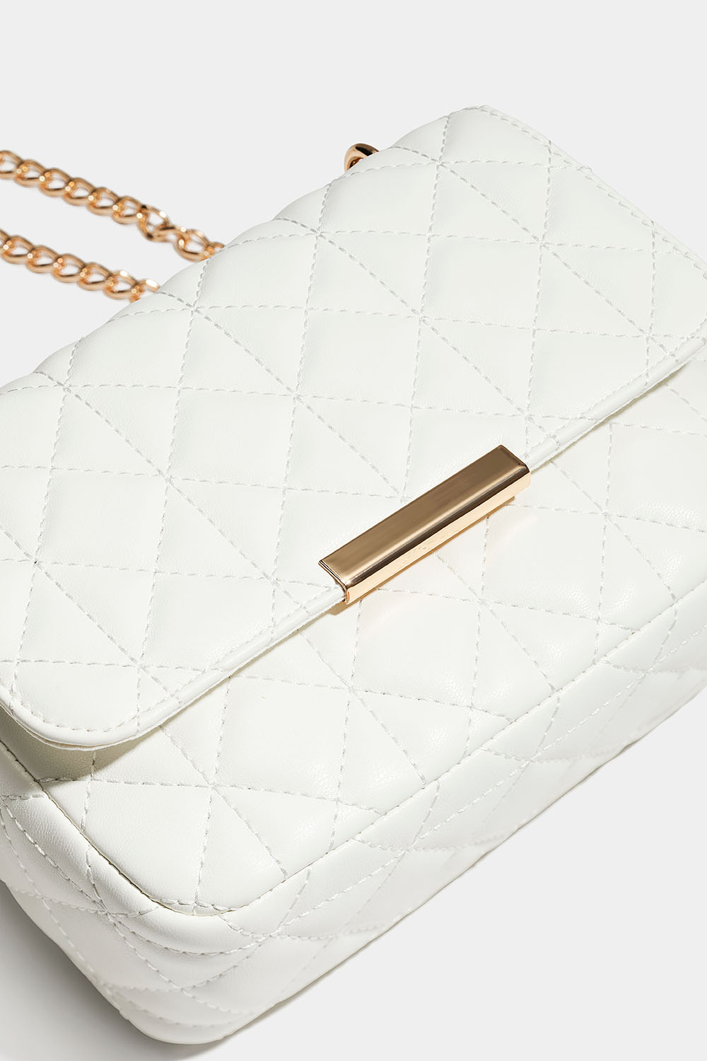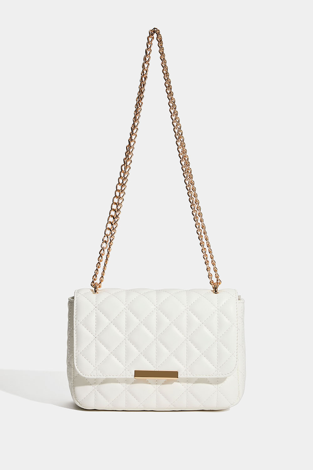 Hvid taske med quiltet design og guldfarvet kædeskulderrem. Du kan enten bruge kæden dobbelt for en kortere skulderrem, eller som en længere, og så kan tasken også bæres som crossbody. Tasken lukkes med en magnetknap og har et lille indvendigt rum, der lukkes med lynlås.