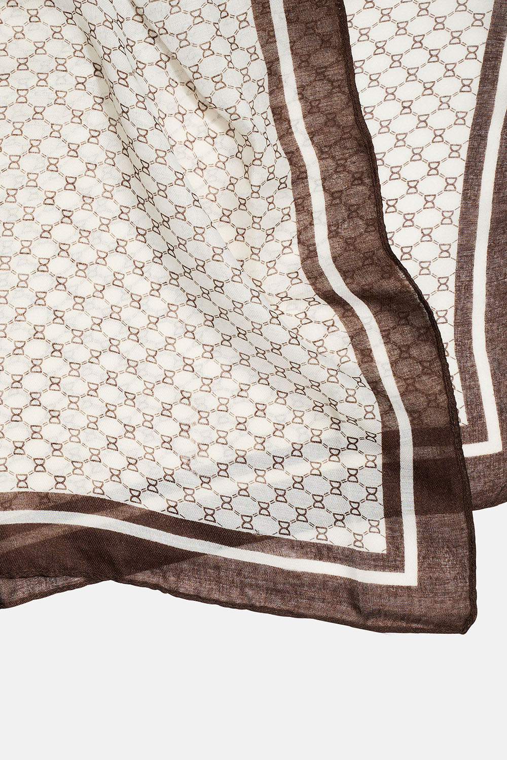 Stort rektangulært sjal fra Don Donna i tyndt materiale med hvidt og brunt DD-mønster.