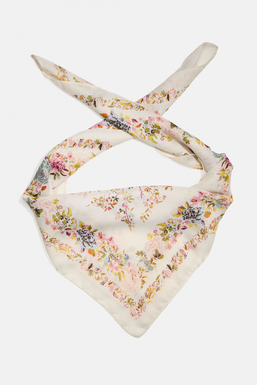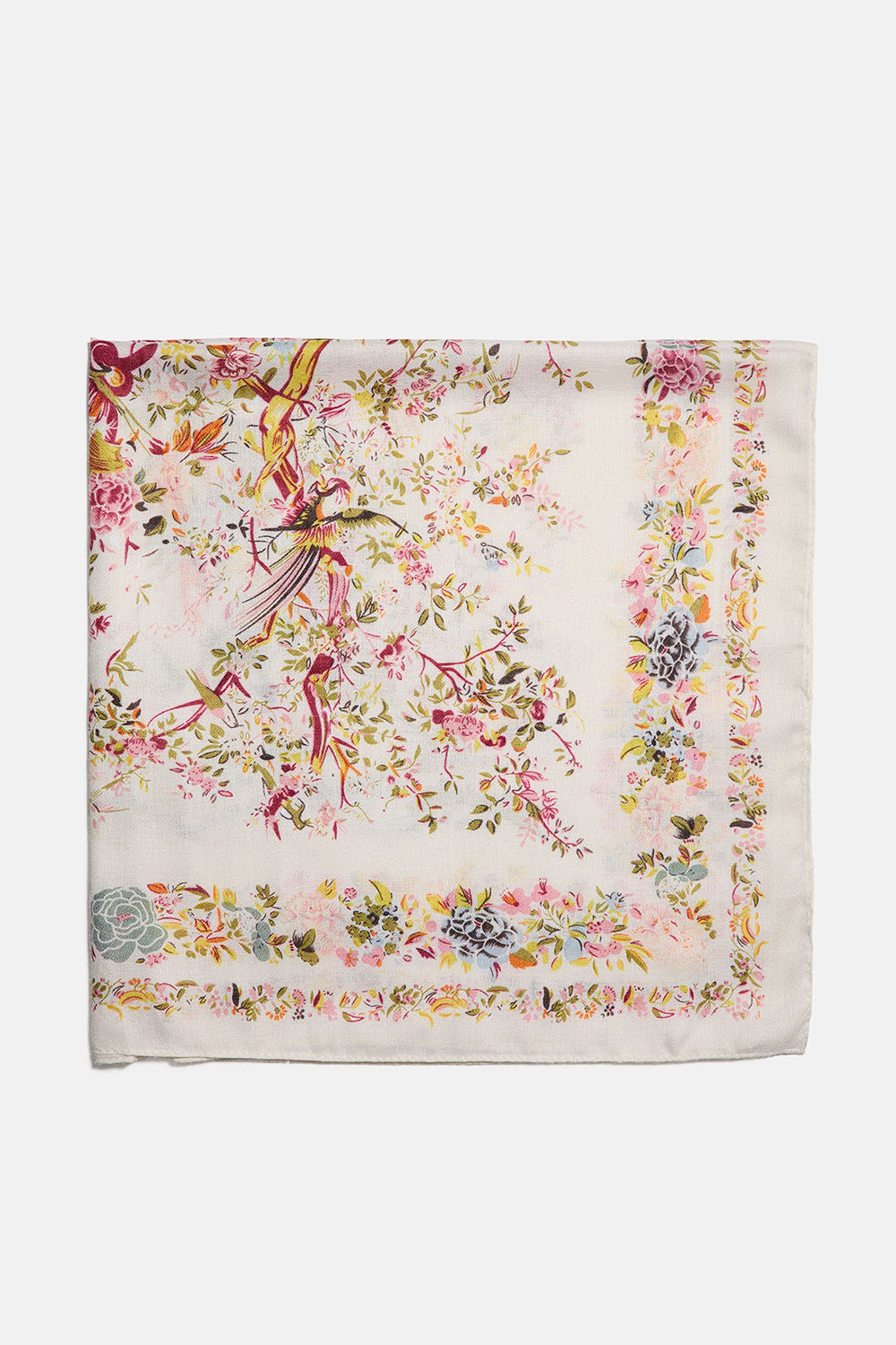 Hvidt firkantet tørklæde med naturmotiver og mønster af fugle og blomster.
