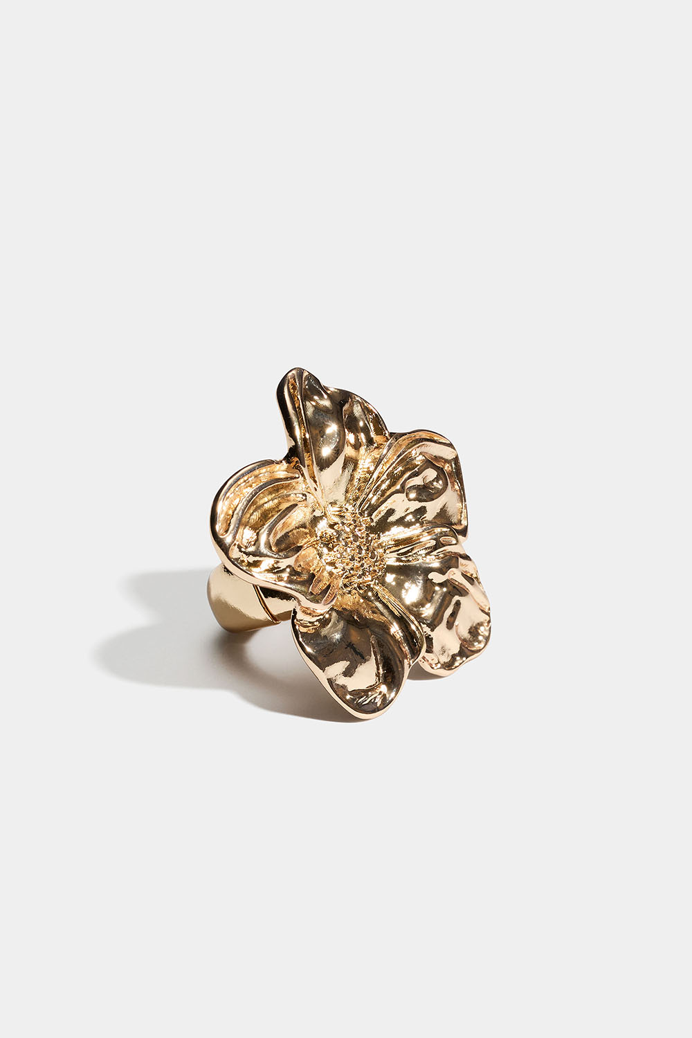 Justerbar ring i guldfarvet metal med stor blomst. Ringen er elastisk og passer til flere forskellige størrelser.