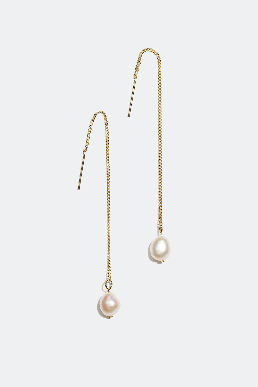 Kædeøreringe i metal med enkel kæde og en ovalformet hvid plastperle i enderne. Øreringen trækkes gennem hullet i øret, så kæden hænger både på for- og bagsiden af øreflippen.