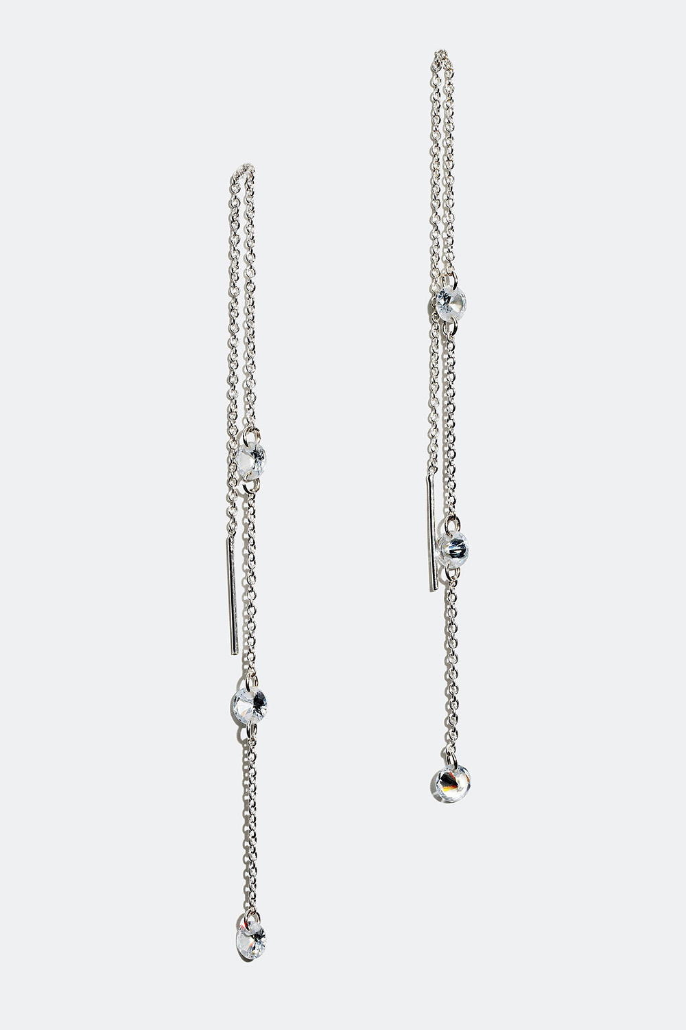 Kædeøreringe i metal med tre dekorative glassten. Et par stilrene træk-igennem-øreringe, der passer til enhver lejlighed. Øreringen trækkes gennem hullet i øret, så kæden hænger både på for- og bagsiden af øreflippen, men kan også trækkes gennem to huller i samme øre.