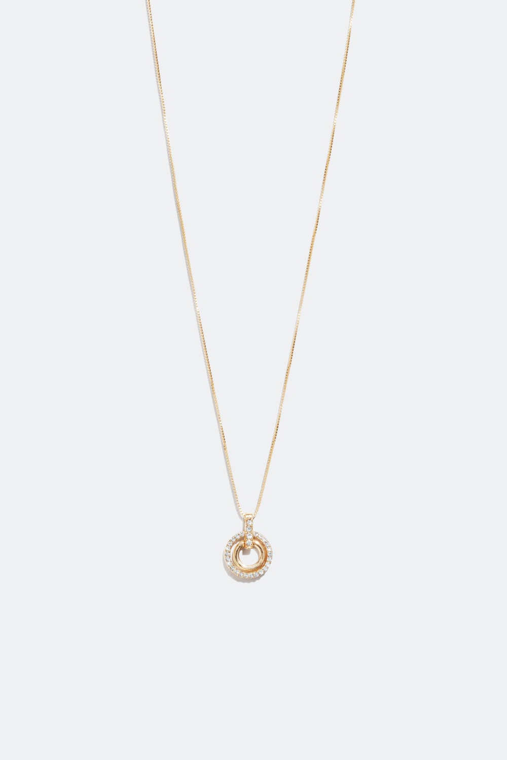 Kort halskæde med en tynd kæde og et rundt vedhæng med similisten. Vedhænget er formet som dobbelte ringe som sidder sammen. Findes i farverne guld og sølv.
