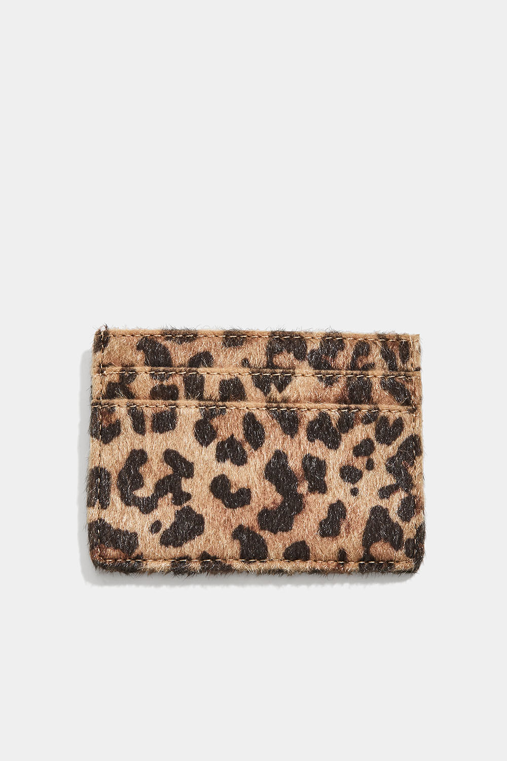 Kortholder i leopardmønstret stof med 5 rum. Praktisk lille pung med to rum på hver side og et lidt større rum i midten til enten flere kort, kvitteringer eller sedler. En stilren kortholder med et dekorativt mønster i den perfekte størrelse til dine vigtigste kort.