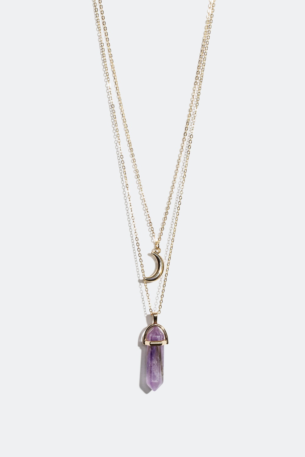 Lag på lag-halskæde med to kæder. Den ene med en halvædelsten i enten rosenkvarts eller ametyst og den anden med en måne eller en stjerne.