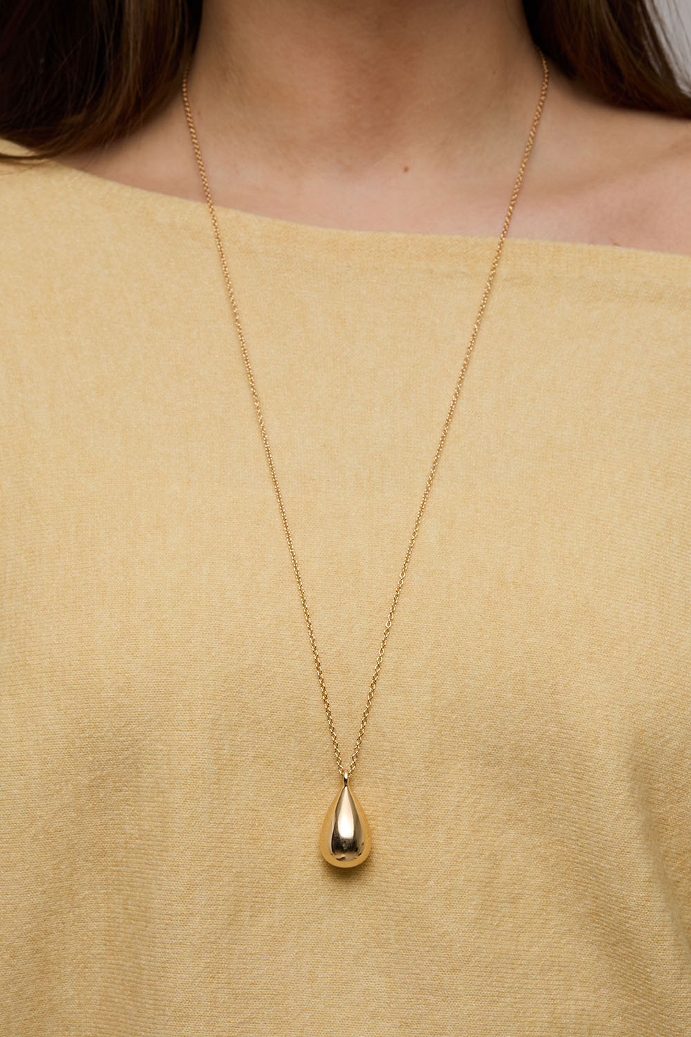 Lang halskæde med tynd kæde og dråbevedhæng i metal.