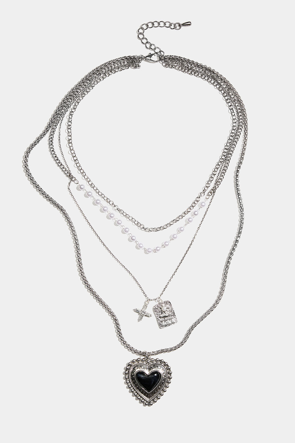 Lang halskæde i mørkt sølvfarvet metal med fire forskellige kæder i forskellige længder og design. Halskæden er blandt andet dekoreret med hvide perler og charms i form af et hjerte.