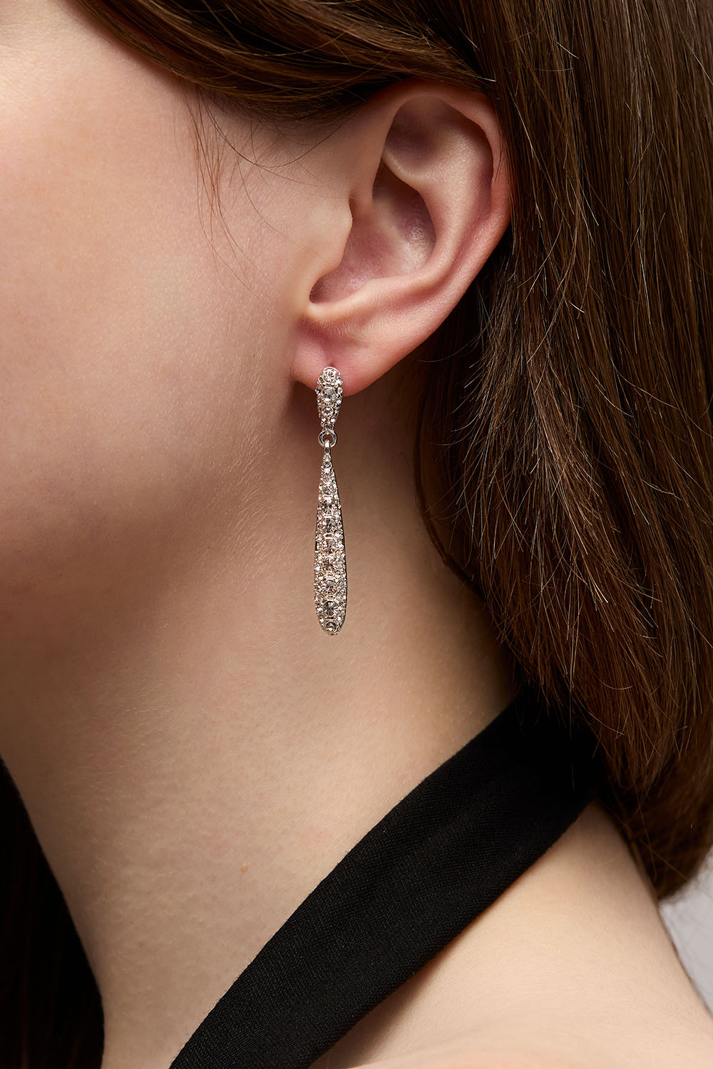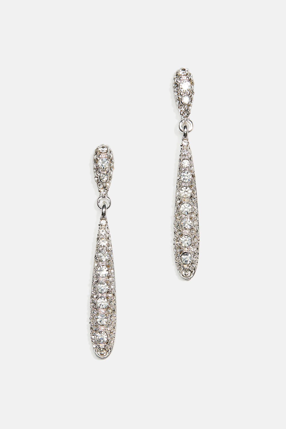Dråbeøreringe med aflang form i sølvfarvet metal, dekoreret med hvide glassten i forskellige størrelser.