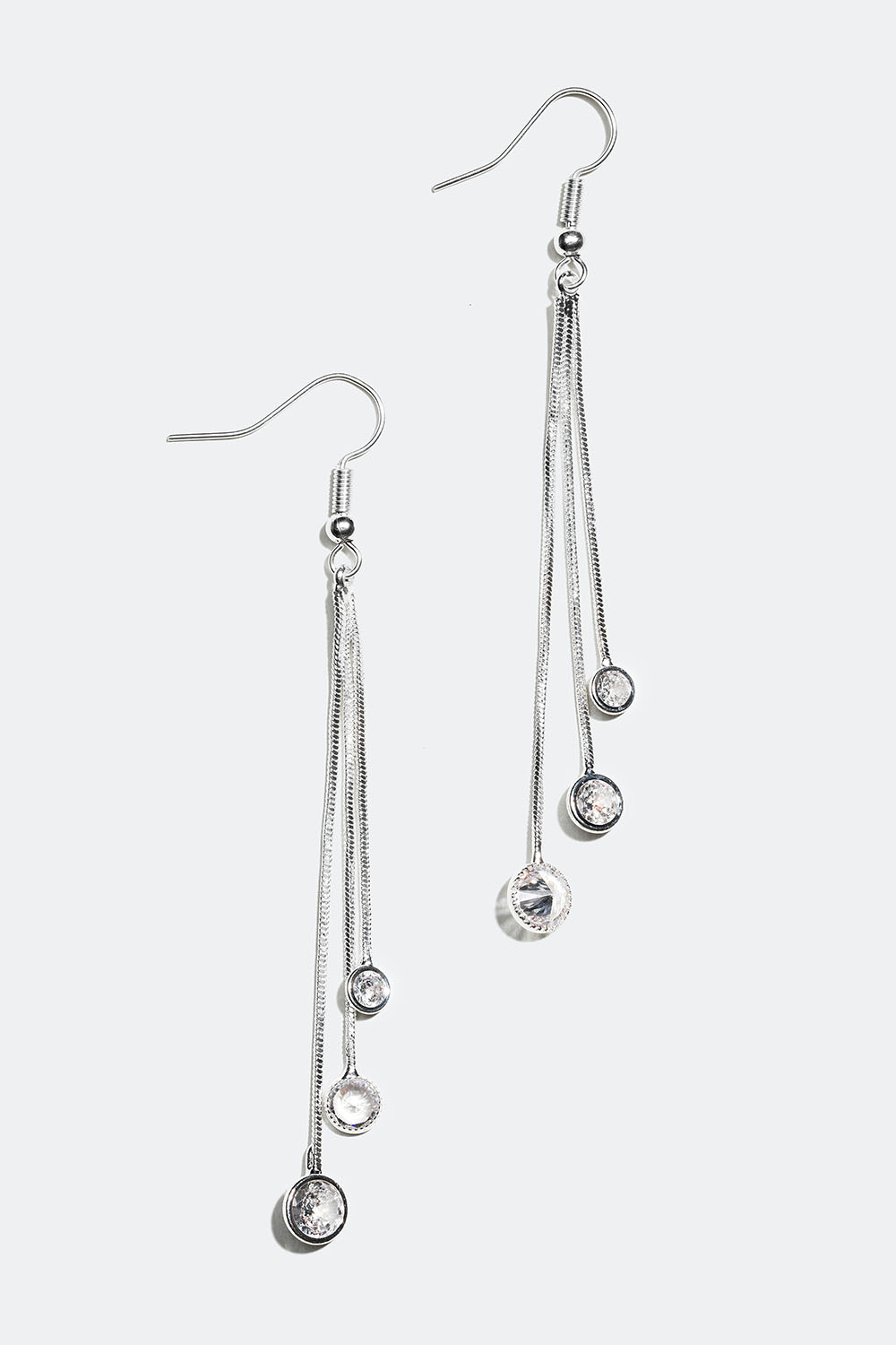 Lange øreringe med tre led i forskellige længder, der er dekoreret med runde glassten nederst.