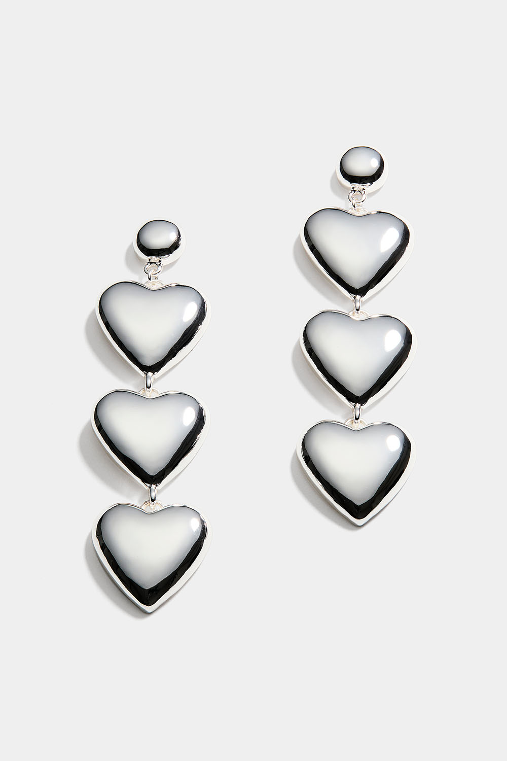 Lange øreringe i blankt metal med tre hængende hjerter.