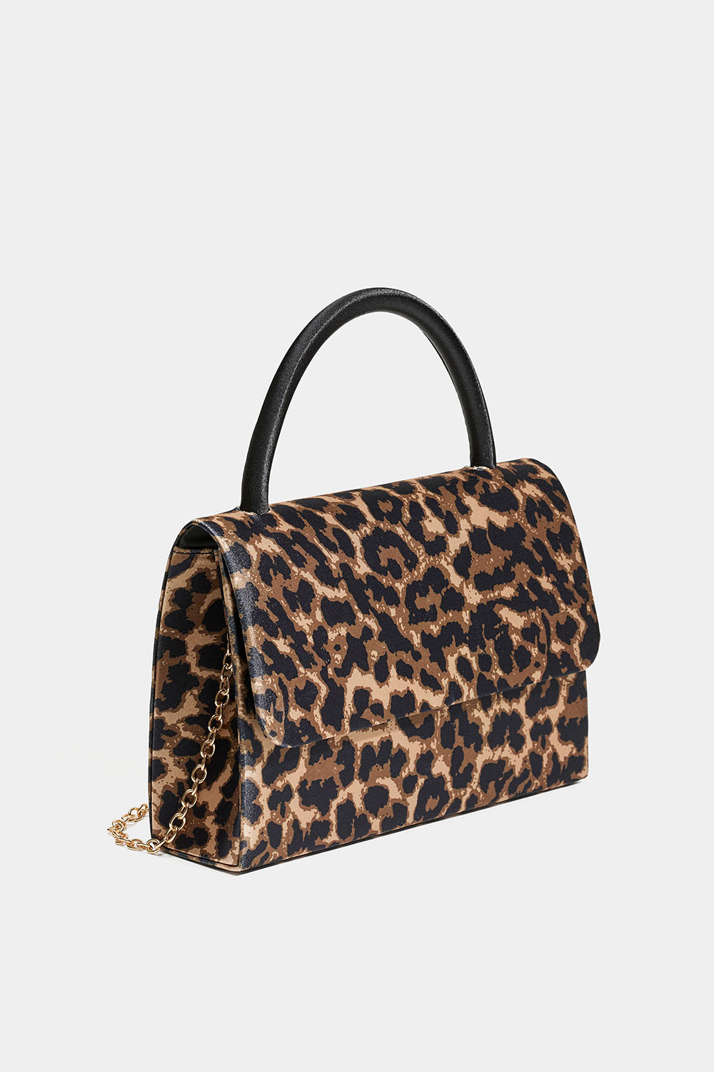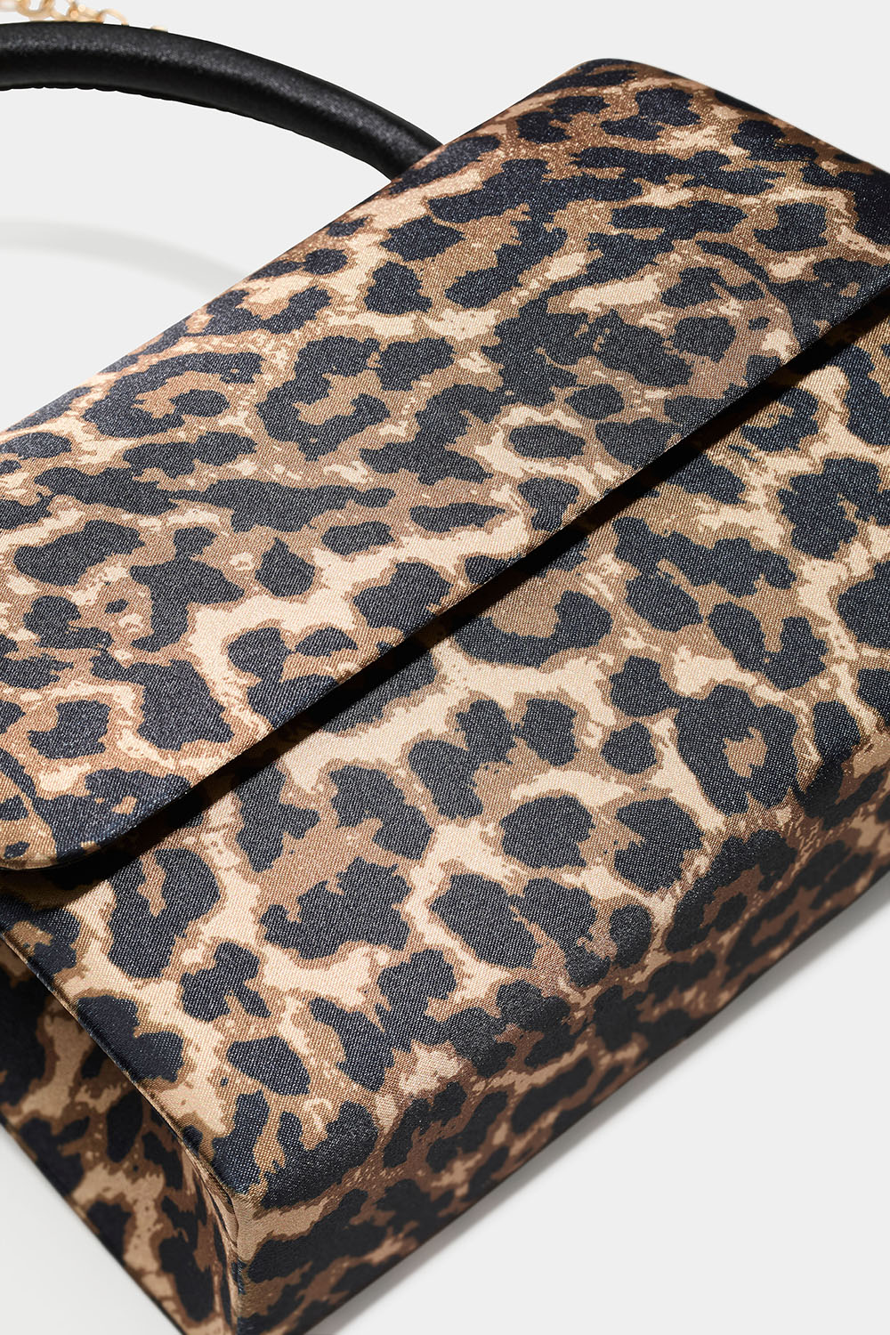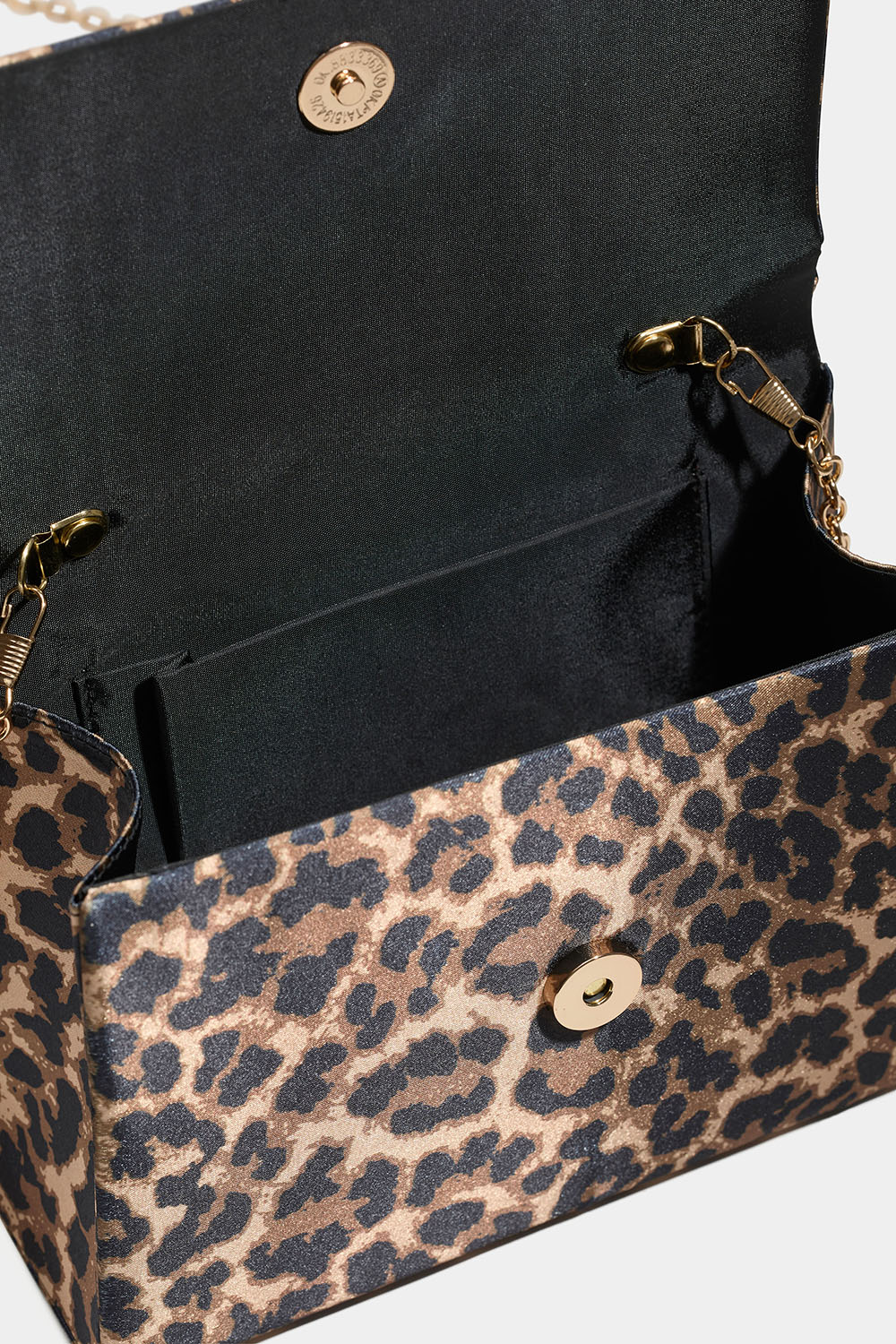 Lille taske i skinnende leopardstof med sort håndtag. Tasken lukkes med magnet og har et mindre rum indvendigt. Der medfølger en aftagelig kæde til skulderremmen.