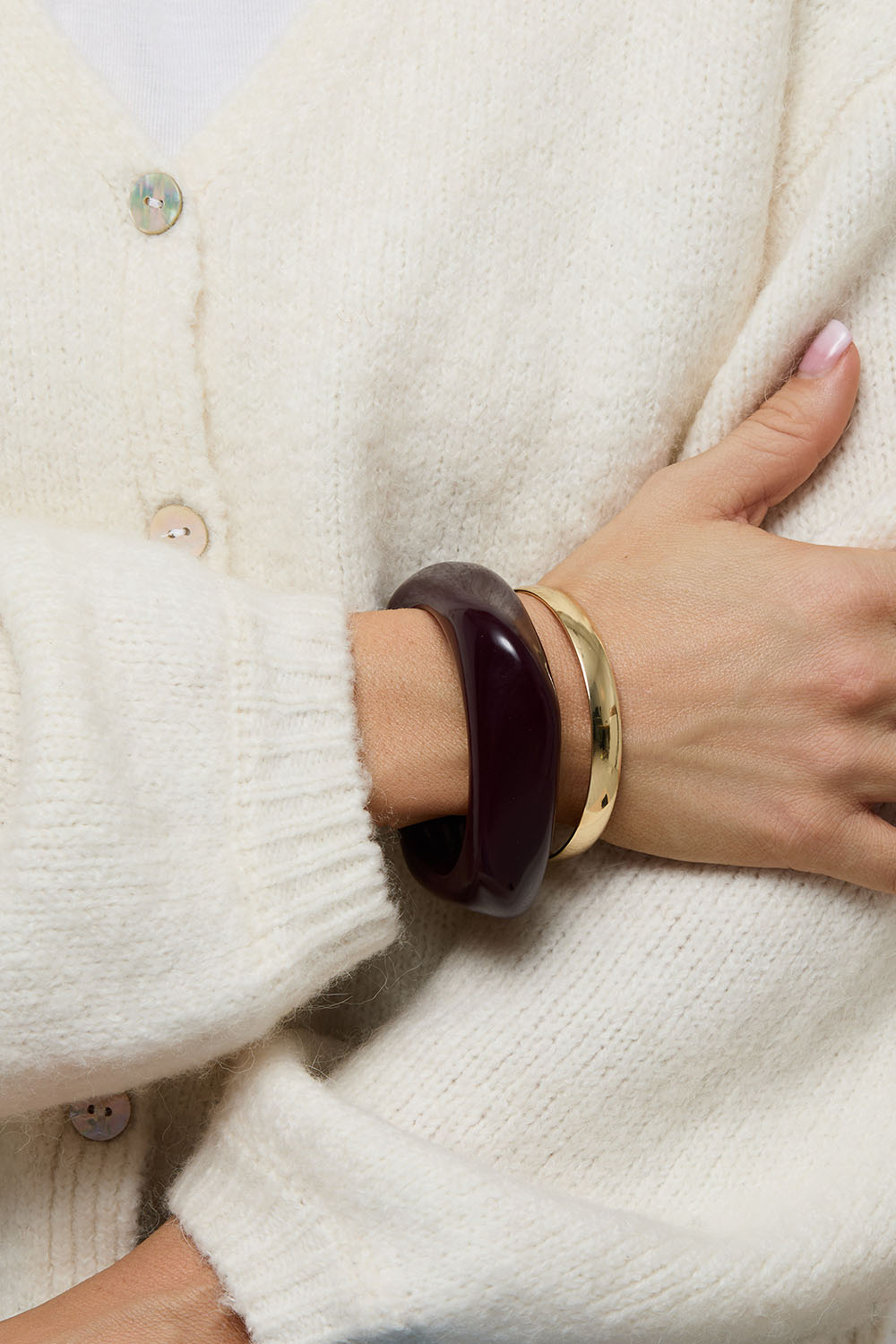 2-pak med en kraftig lilla armring og en tynd armring i guldfarvet metal.