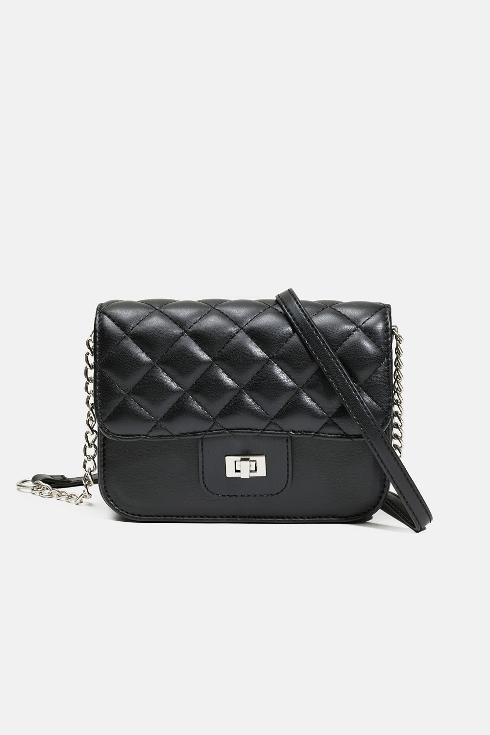 Sort quiltet børnetaske med skulderrem i sølvfarvet kæde. Tasken har et stort rum, der lukkes med et drejespænde.