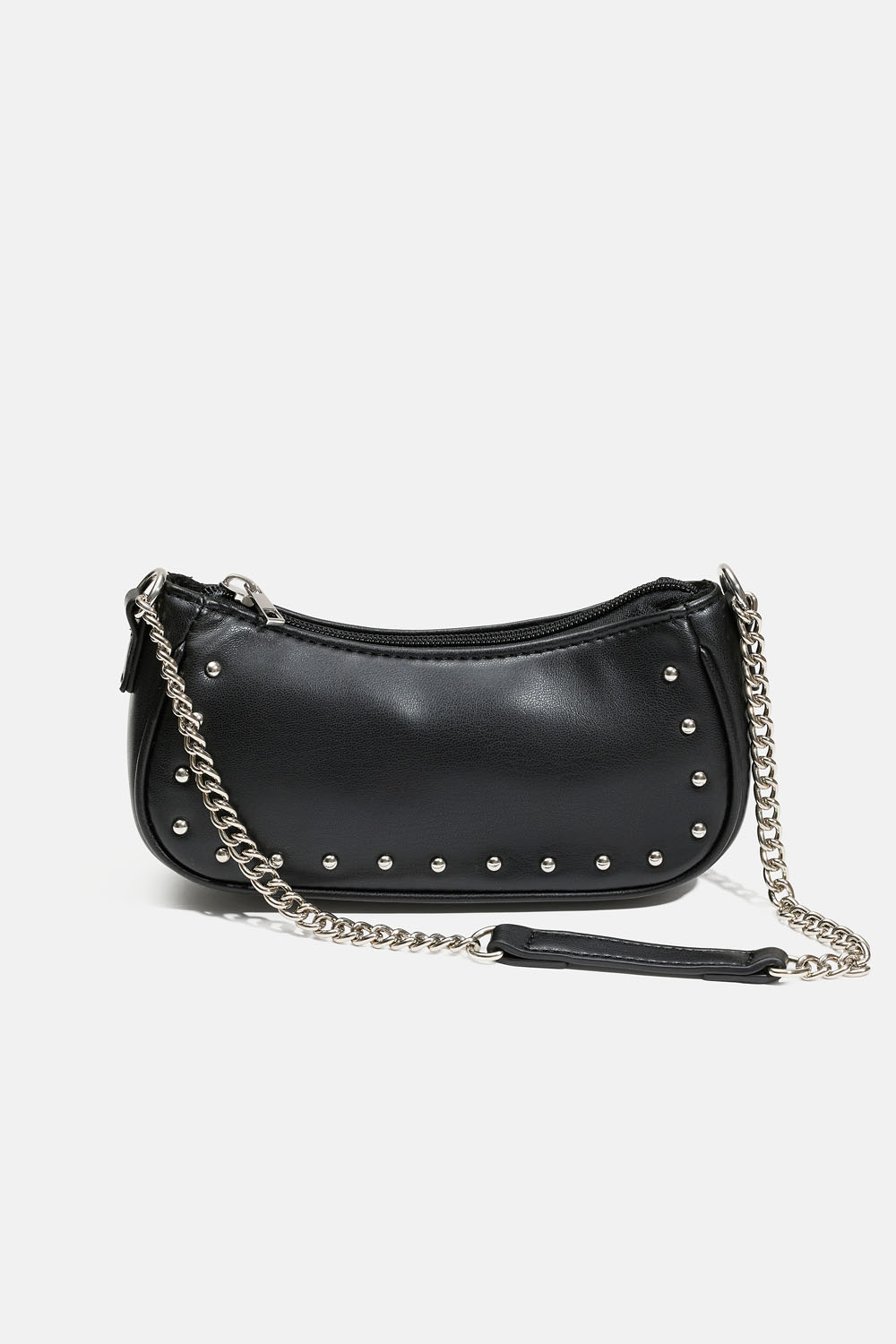 Sort baguettetaske i sort imiteret læder med afrundede nitter og kædeskulderrem. Tasken lukkes med en lynlås.