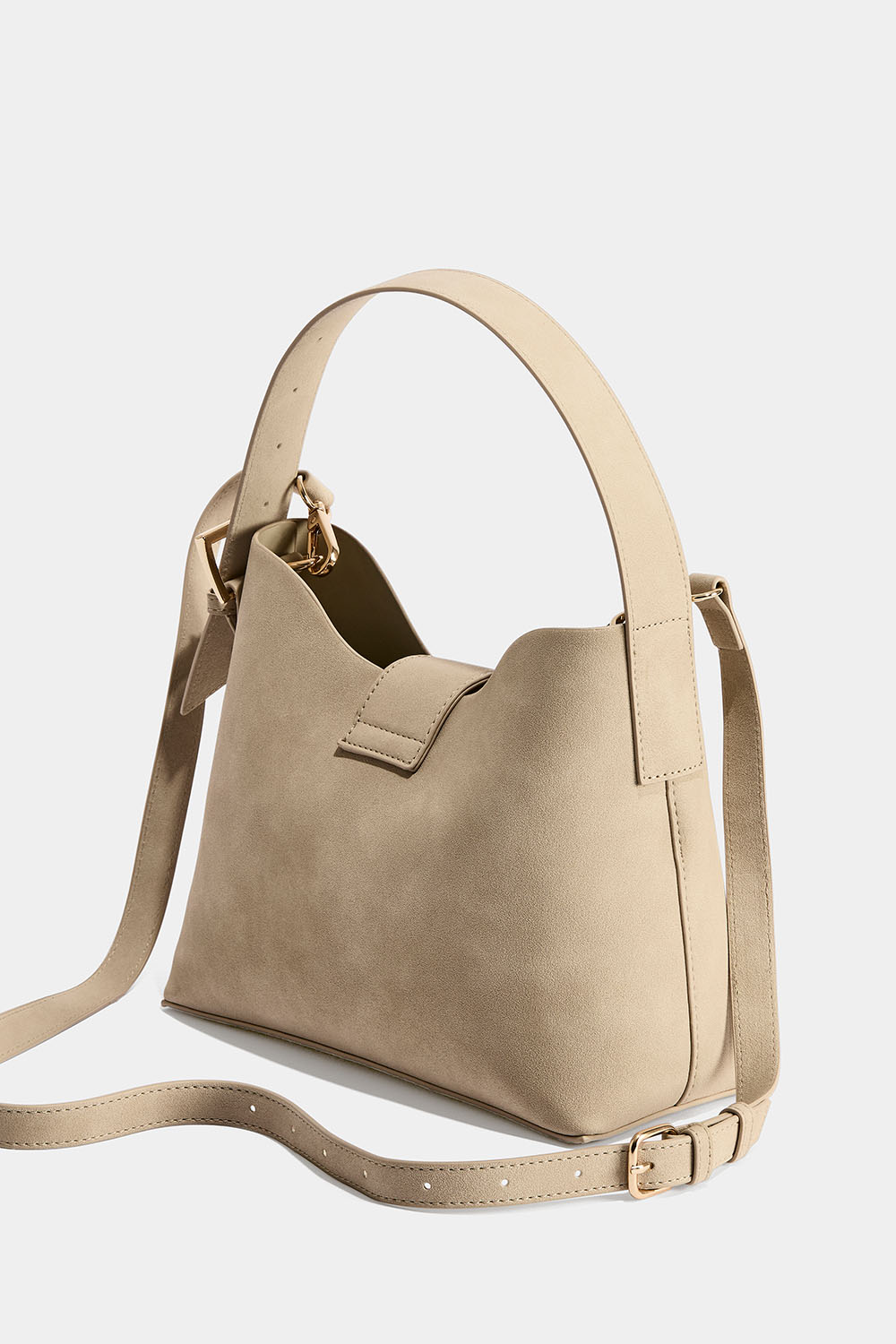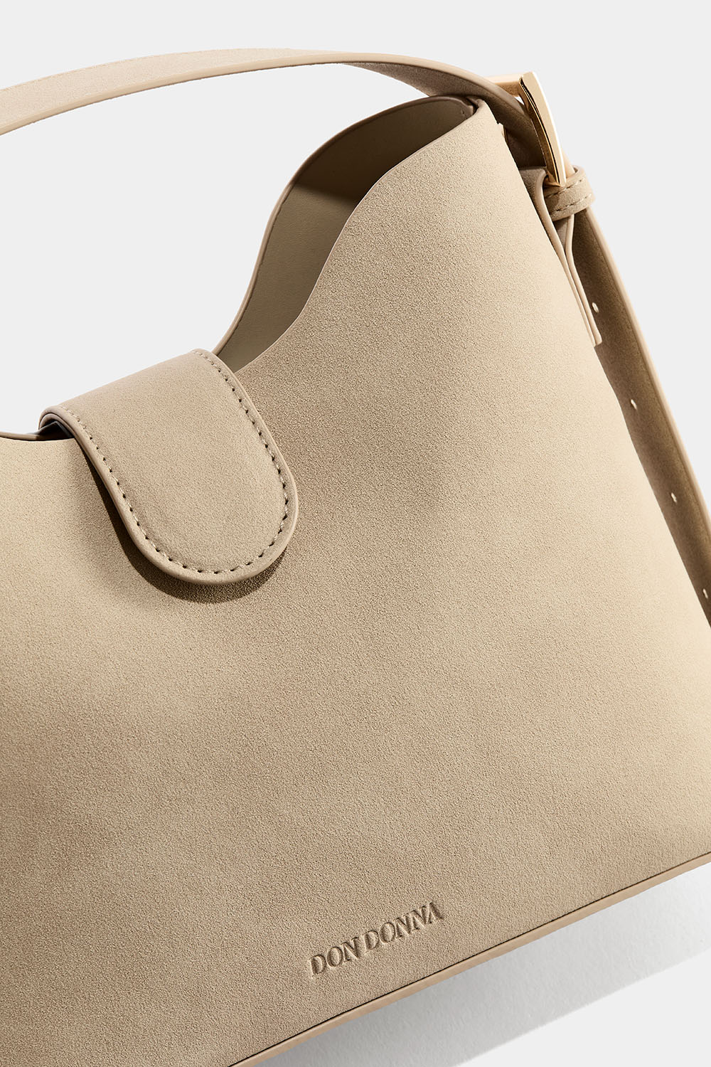 En lille beige taske i imiteret nubuck med en lang aftagelig crossbody-rem, justerbar skulderrem og guldfarvede detaljer. Den har en mindre inderlomme, der kan lukkes med en lynlås, som deler tasken i to dele indvendigt. En perfekt hverdagstaske og tilbehør til arbejdet eller en dag i byen.