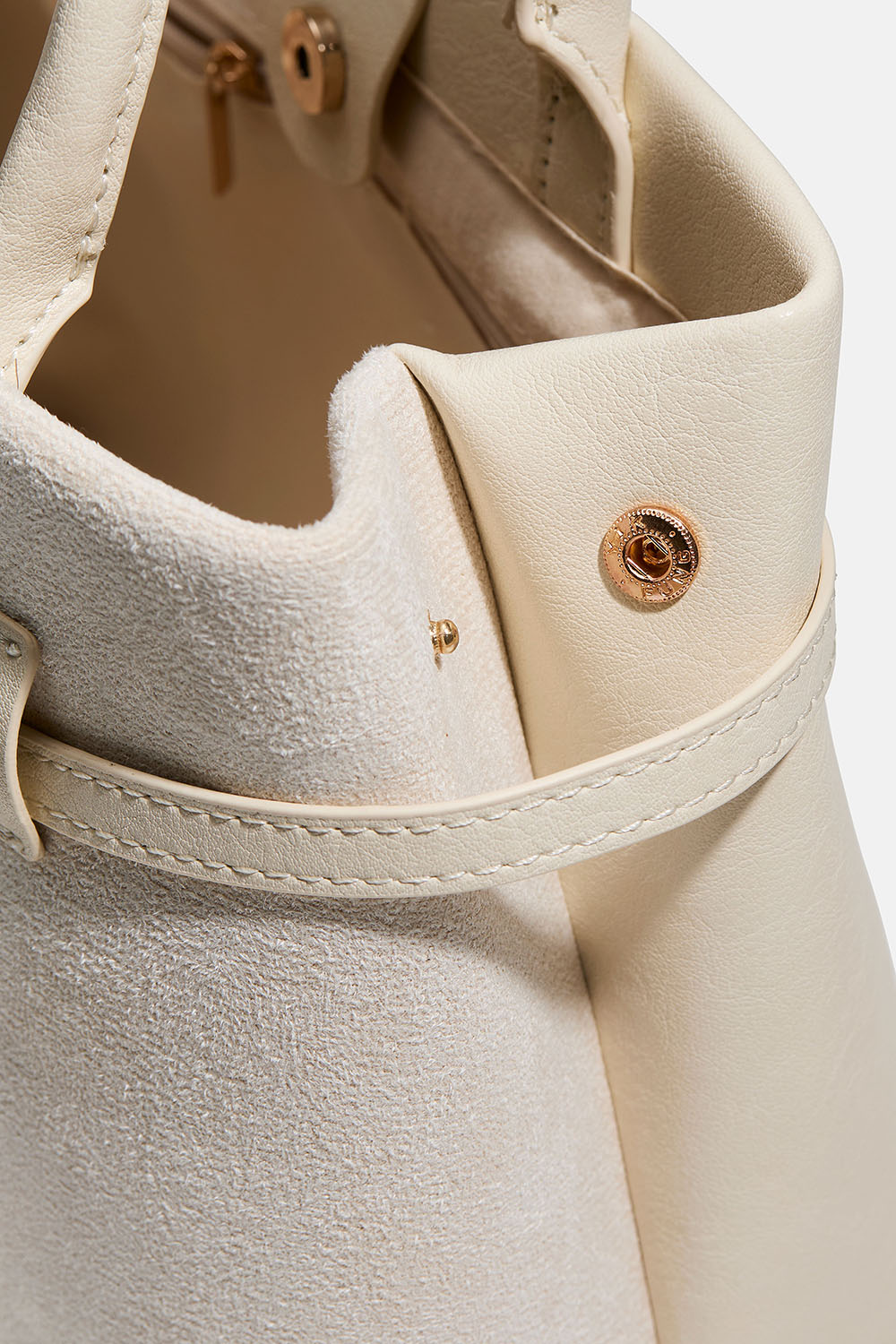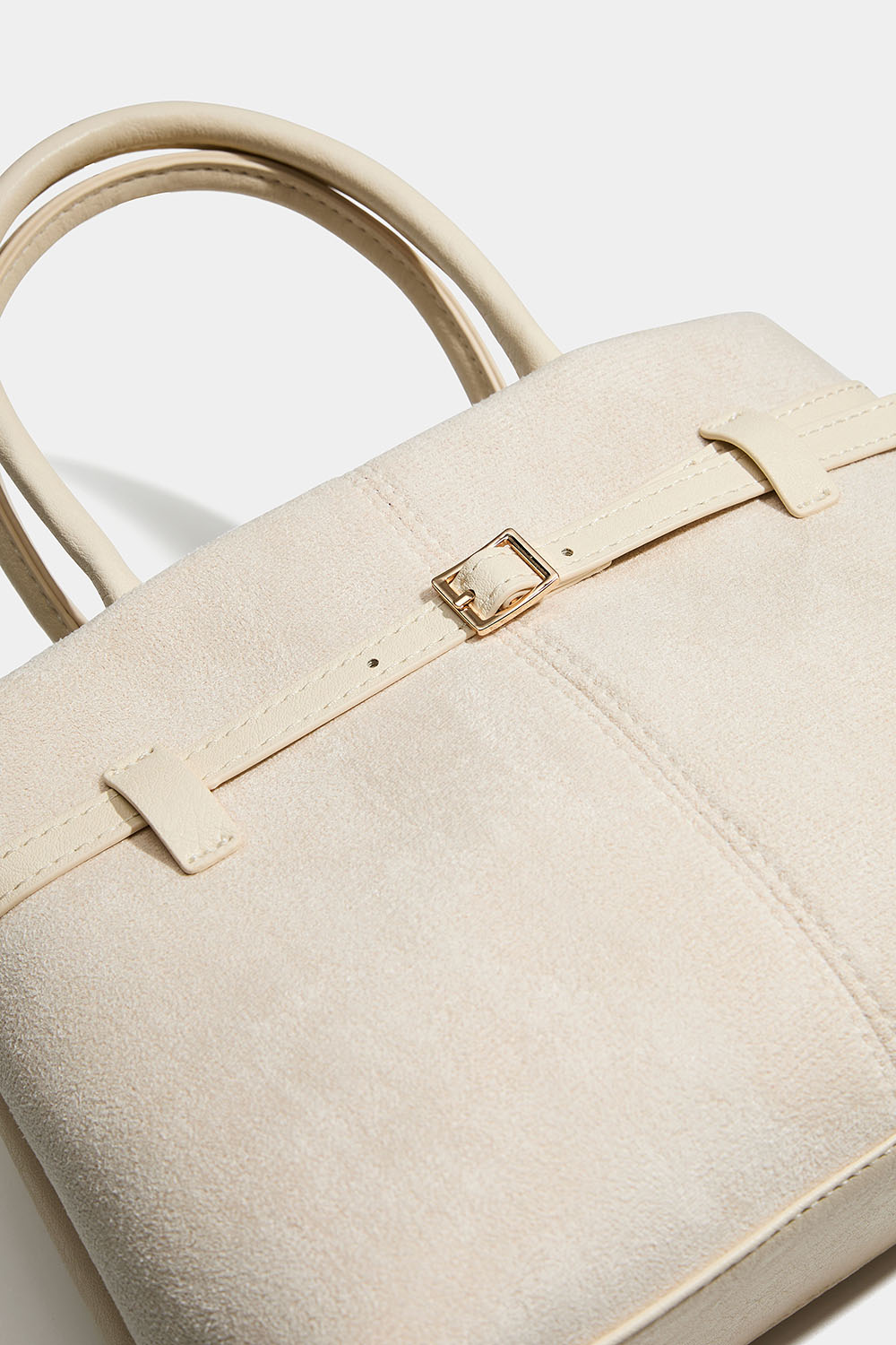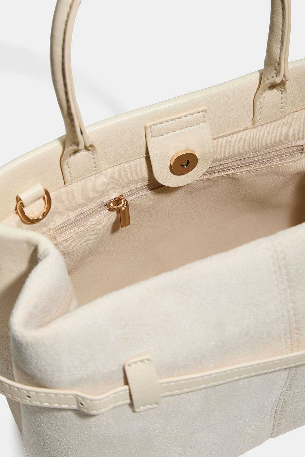 Lille, beige rektangulær taske i imiteret ruskind og læder med et smalt bælte omkring. Tasken har et stort rum, der lukkes med magnet og et mindre rum med lynlås indeni. Der medfølger en justerbar skulderrem.