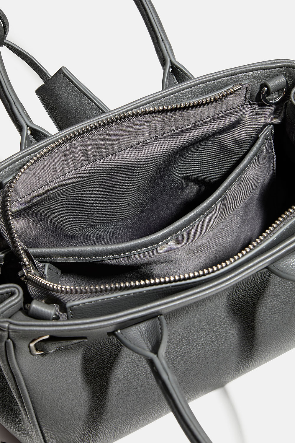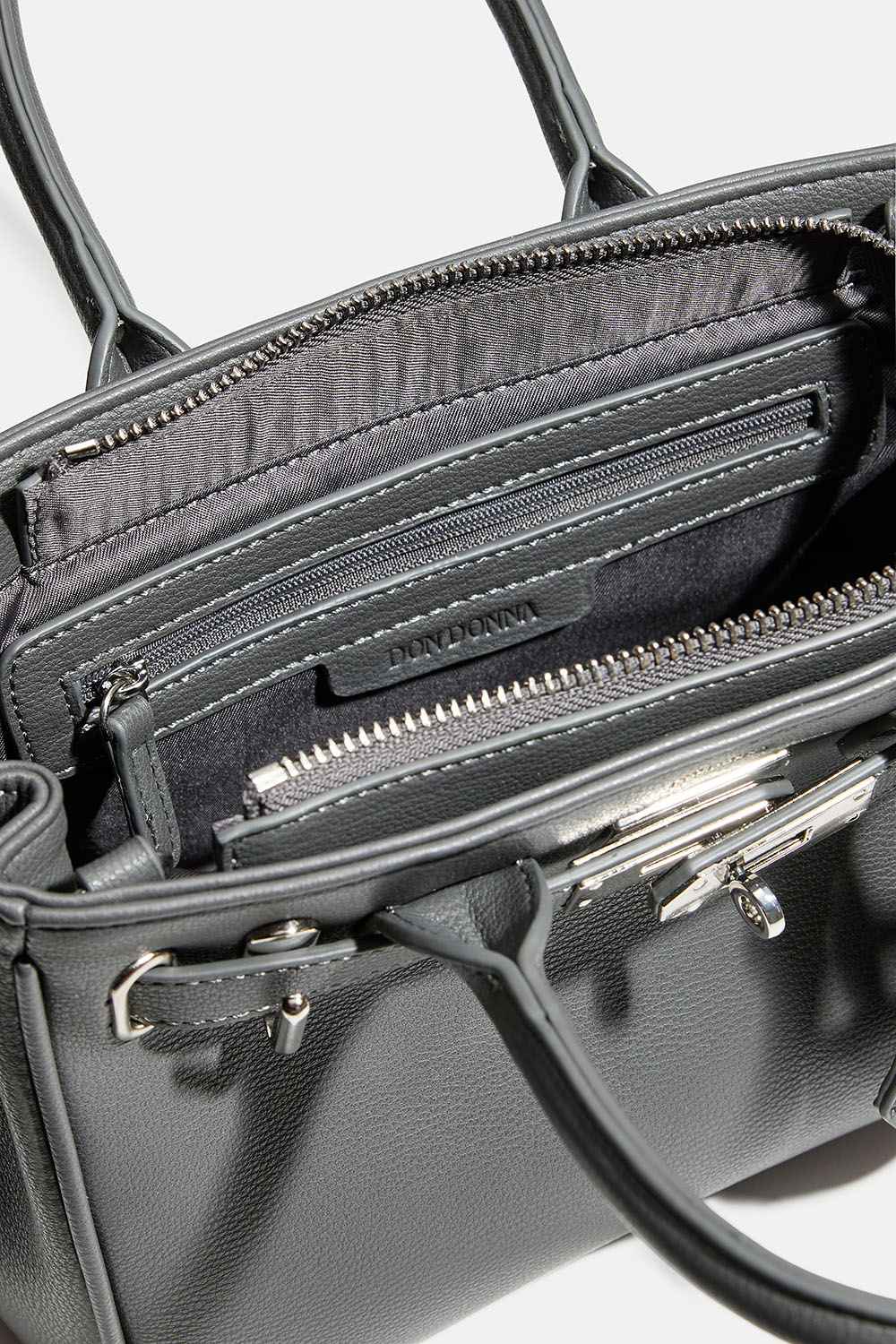 Lille shopper-taske i sort imiteret læder med bæltedetaljer. Tasken har et stort rum med lynlås og to mindre rum indeni. Den leveres med en nøglering og en justerbar skulderrem.