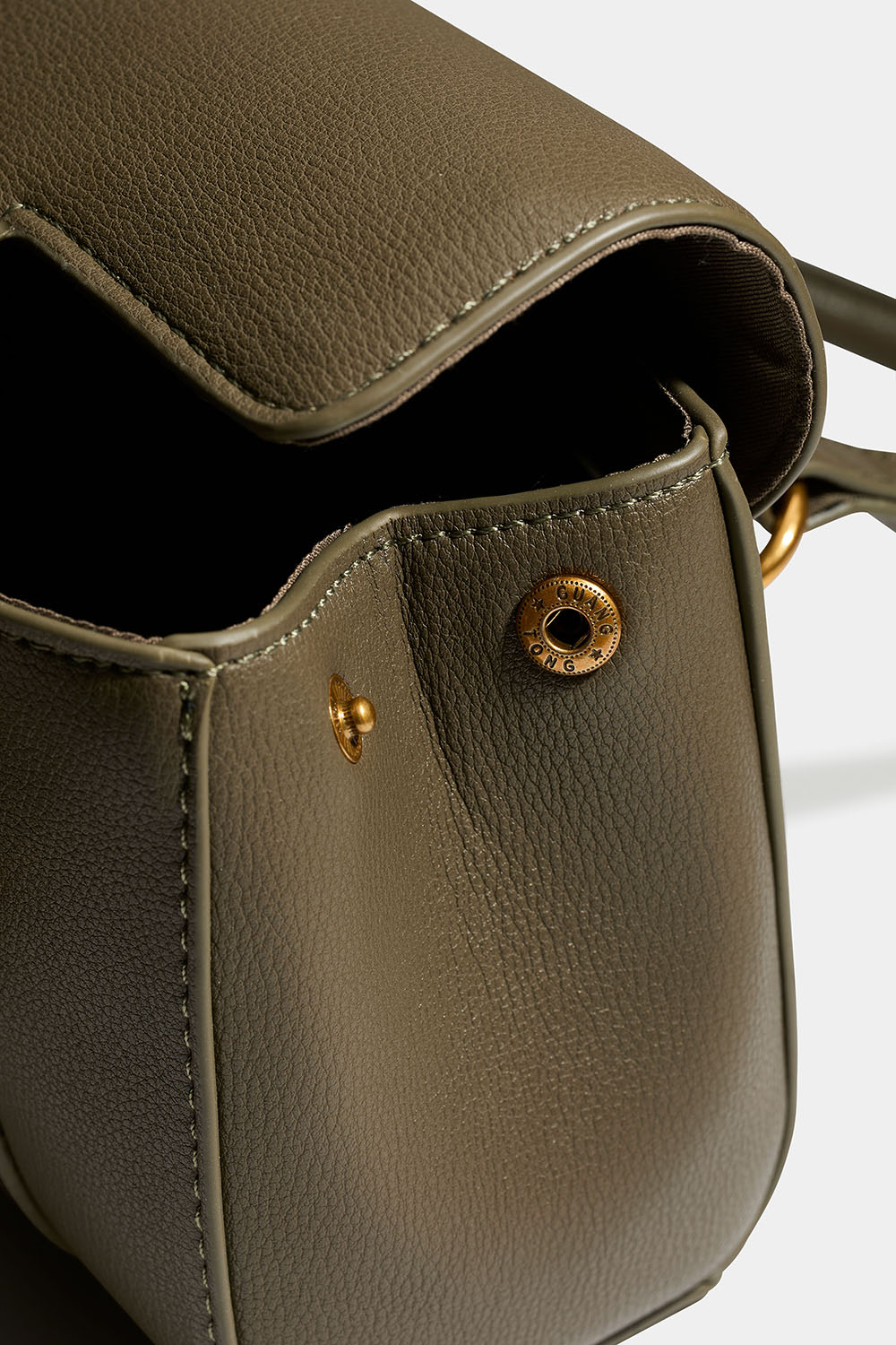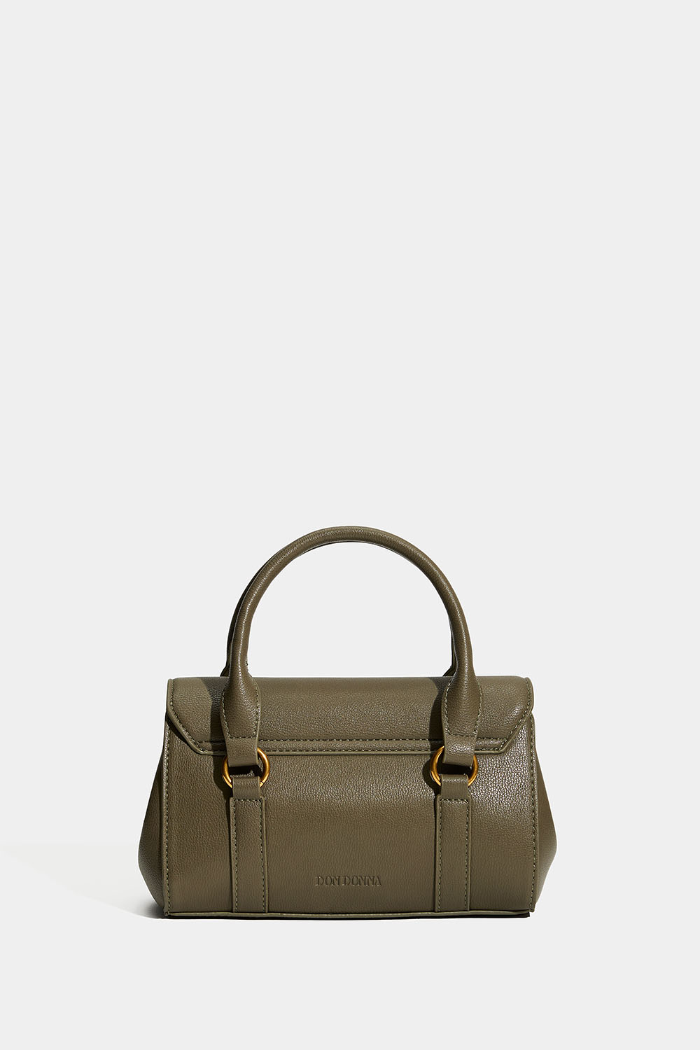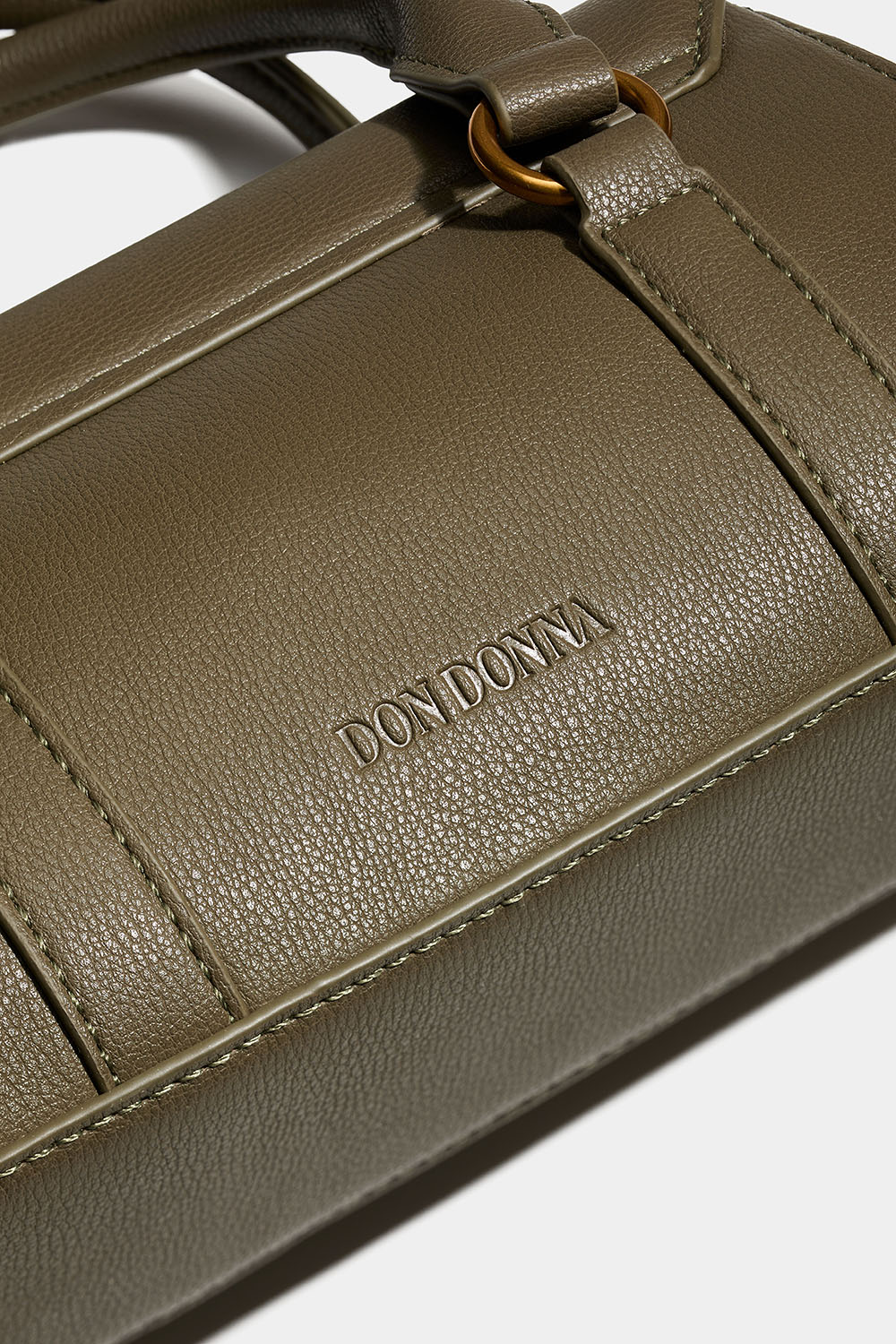 Lille grøn håndtaske fra Don Donna i imiteret læder med Don Donna-logoet præget på bagsiden og detaljer i mat guldfarvet metal. Den leveres også med en længere skulderrem, så du også kan bruge tasken som crossbody.