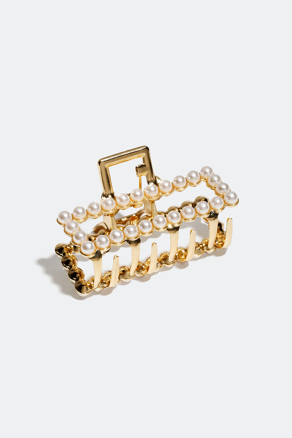 Lille rektangulær hårklemme i guldfarvet metal med dekorative perler langs kanten. Et lille hårpynt, der er skånsomt mod håret. Perfekt til mindre opsætninger såsom halve opsætninger.