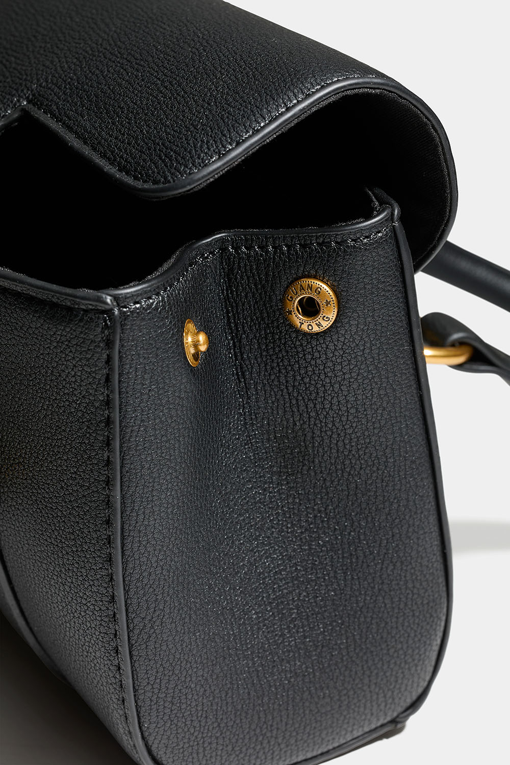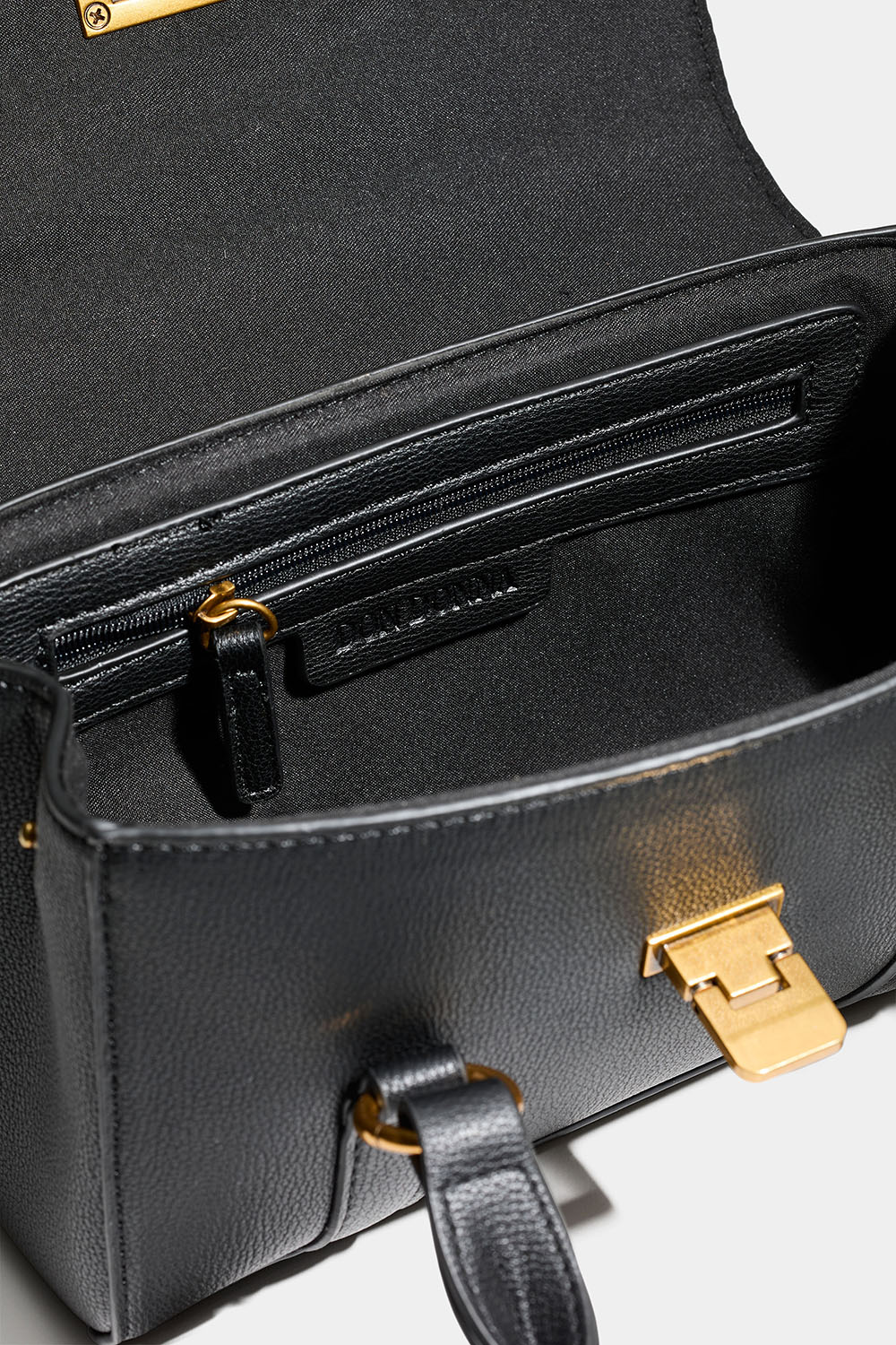 Lille sort håndtaske fra Don Donna i imiteret læder med Don Donna-logo præget på bagsiden og detaljer i mat guldfarvet metal. Den leveres også med en længere skulderrem, så du også kan bruge tasken som crossbody.