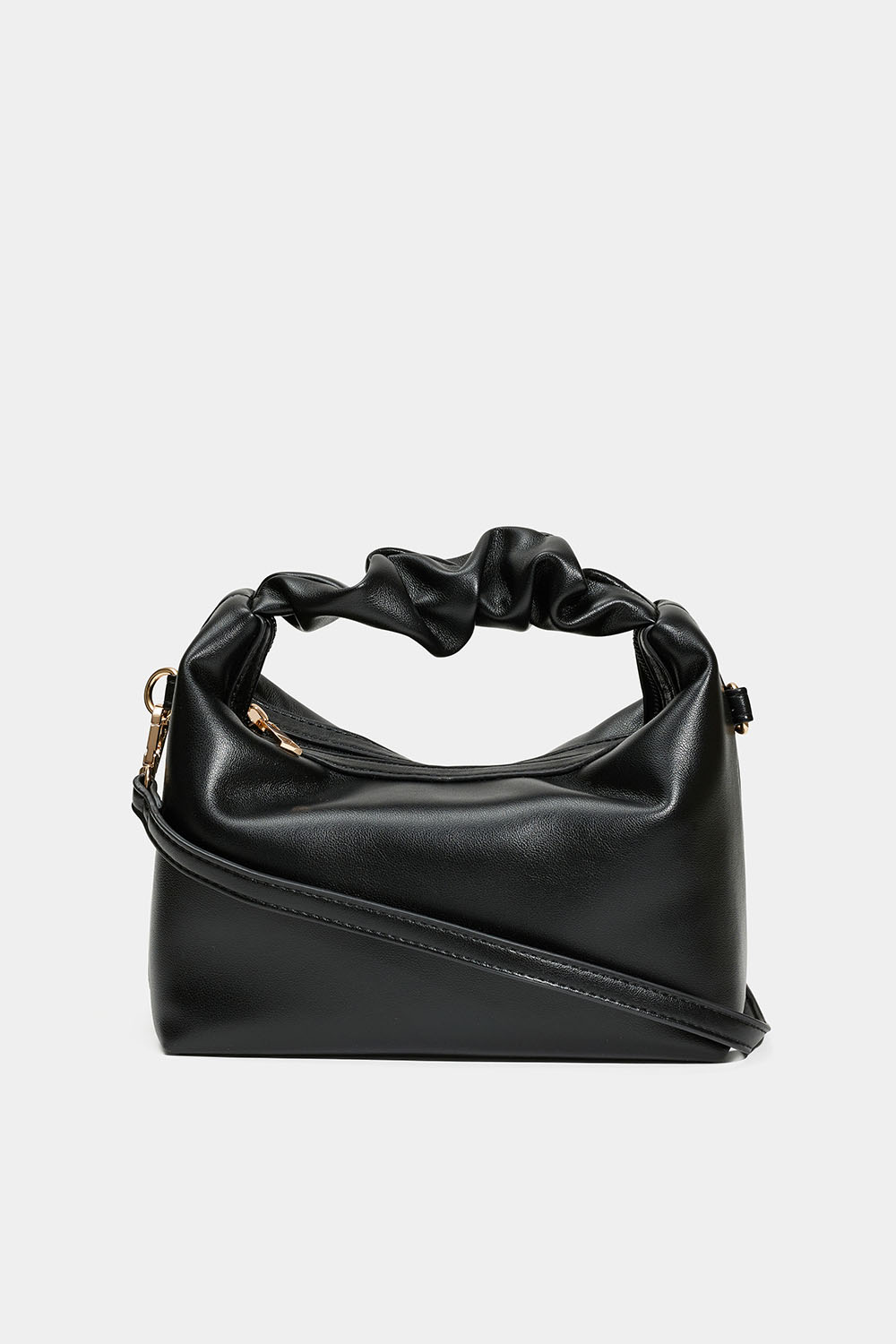 Lille taske i sort imiteret læder med rynket håndtag. Tasken lukkes med lynlås, og der medfølger en justerbar skulderrem.