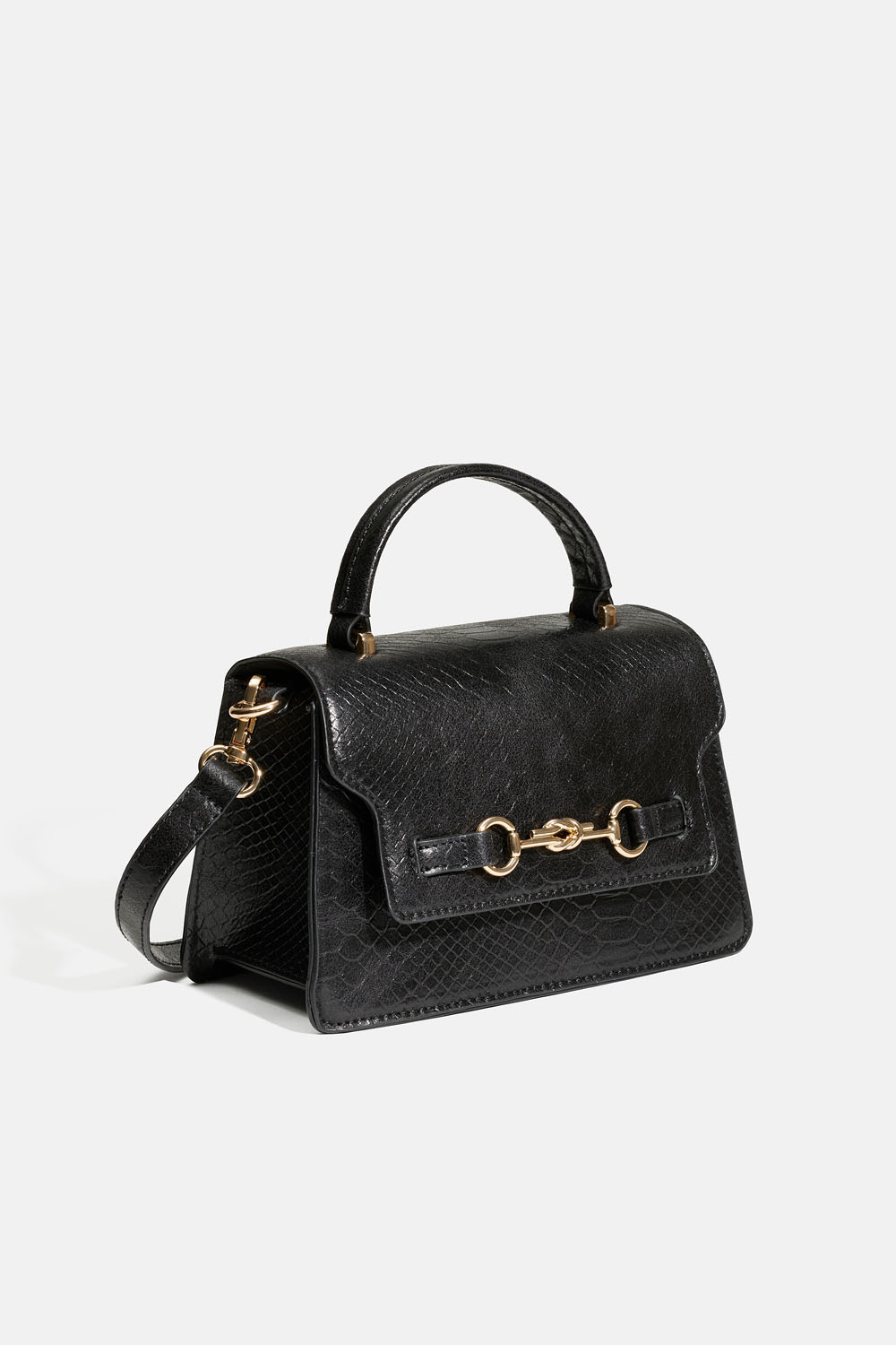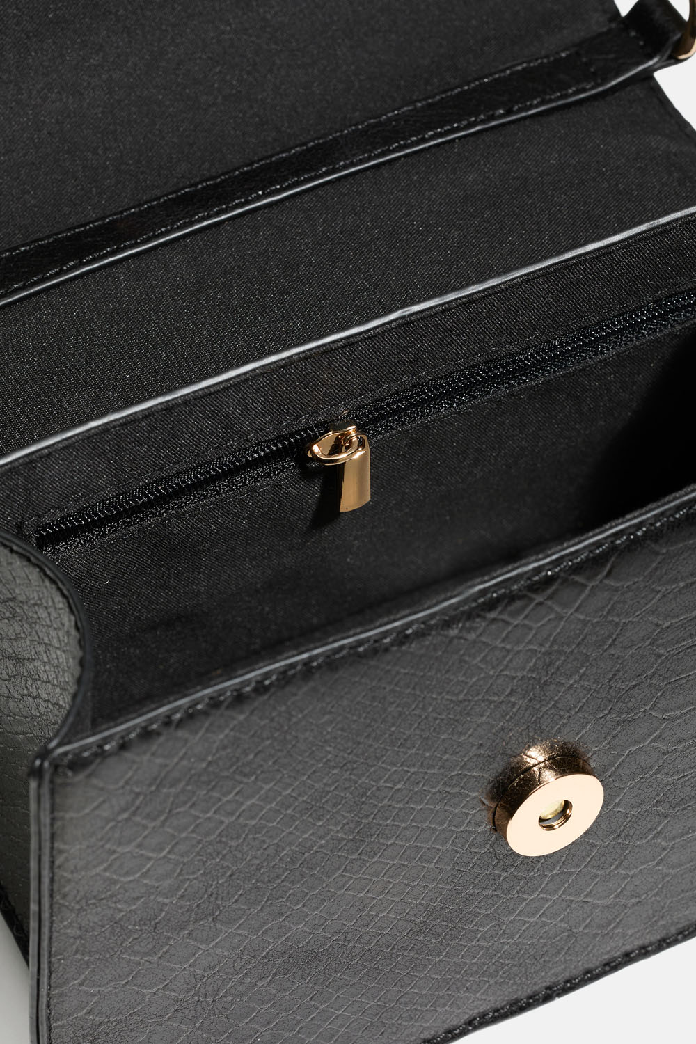 Lille taske i sort slangeskindstekstur og guldfarvede metalknapper. Tasken lukkes med magnet og har et mindre rum indeni, som lukkes med lynlås. Der medfølger en justerbar skulderrem.