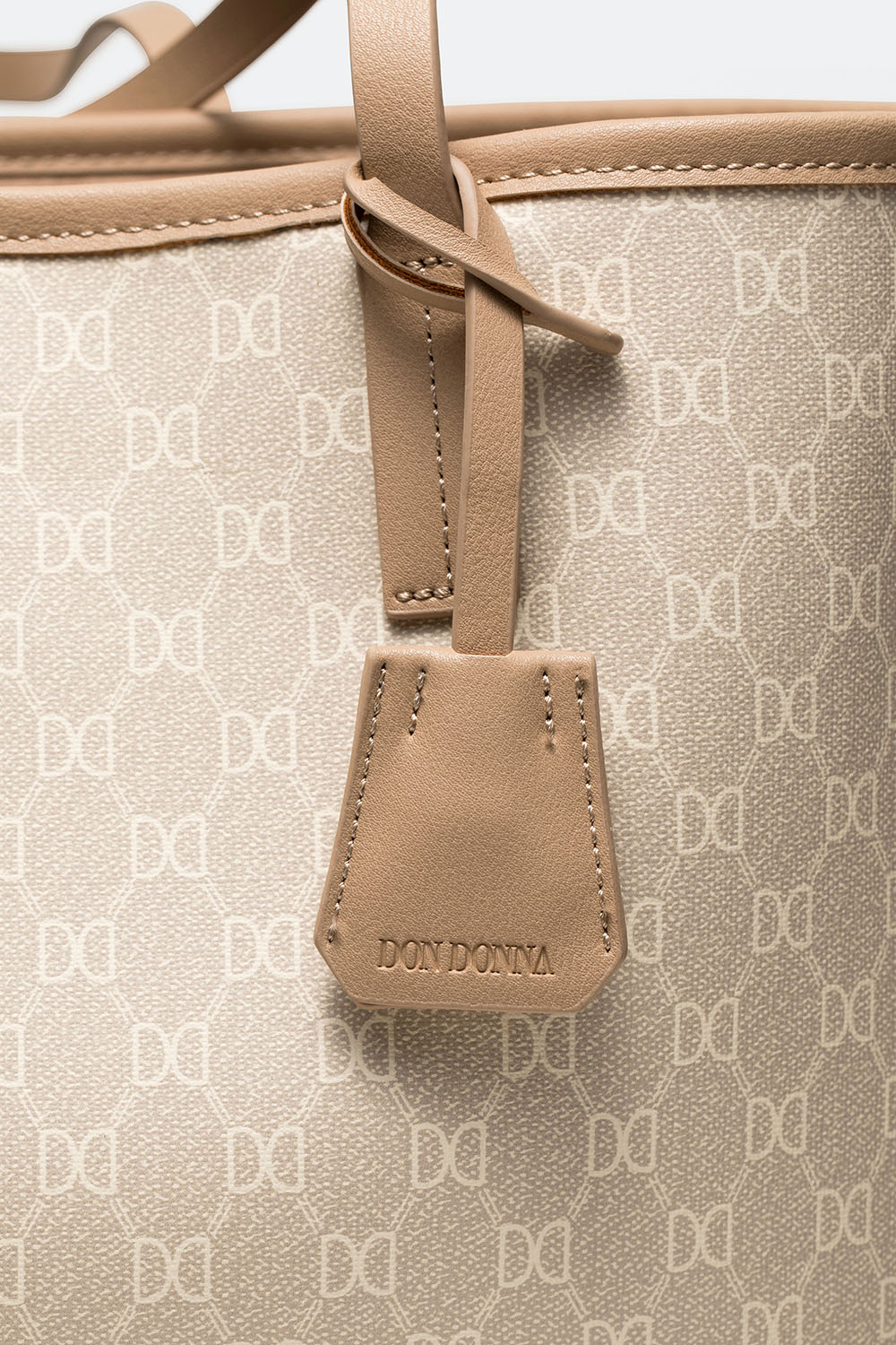 Stor lys beige tote bag med Don Donna-logoet trykt. En stilren taske med smalle hanke, der kombinerer mode med funktion med nøglering, et stort rum og to mindre rum indeni. Perfekt hverdagstaske og tilbehør til arbejde og skole med masser af plads og smart opbevaring.