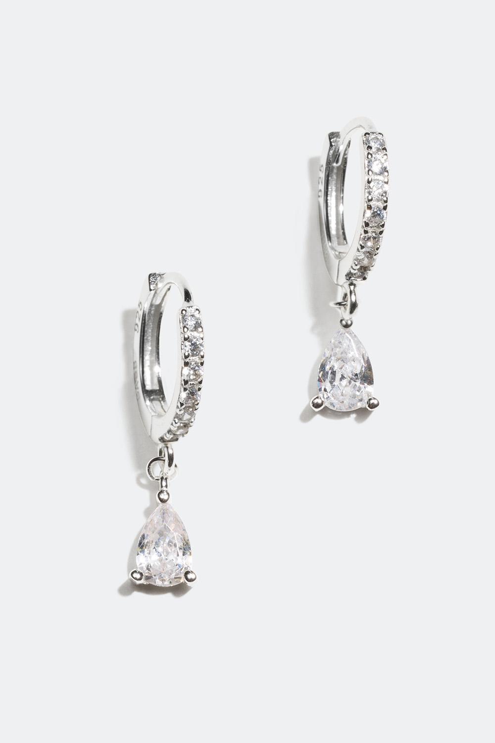 Mini-hoops i ægte sølv med klare sten i kubisk zirkonia fortil og dråbeformede vedhæng med en stor sten i kubisk zirkonia. Et par dekorative øreringe med et elegant design, som tilfører dit look både glimmer og farve og passer perfekt til festen.