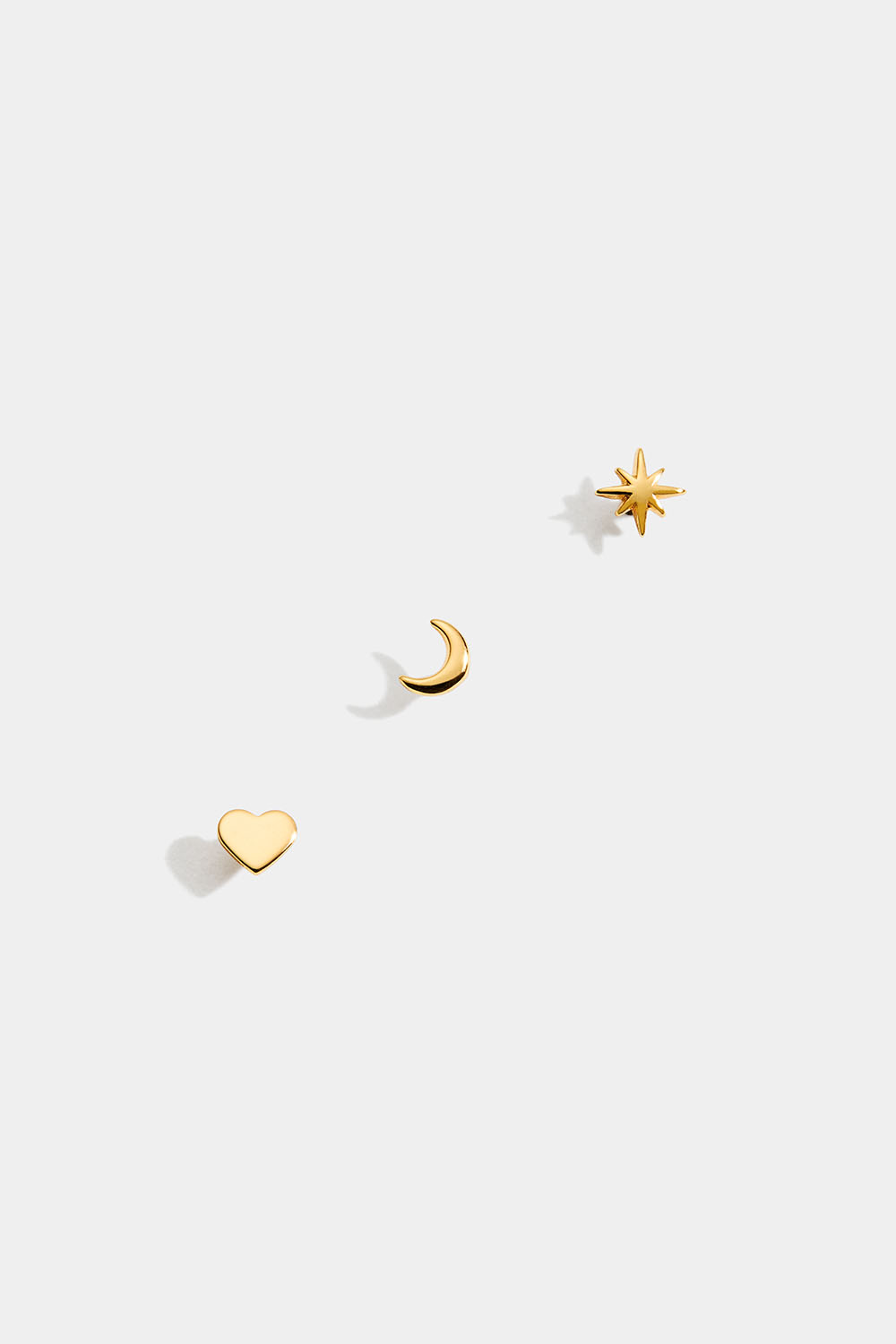 3-pak med miniørestikker i forskellige former til dem, der har flere huller i ørerne. Øreringene er lavet i 18k forgyldt ægte sølv i form af en stjerne, en måne og et hjerte.