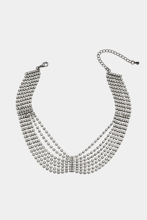 Choker-halskæde i grå gun metal-farve dekoreret med små hvide glassten.