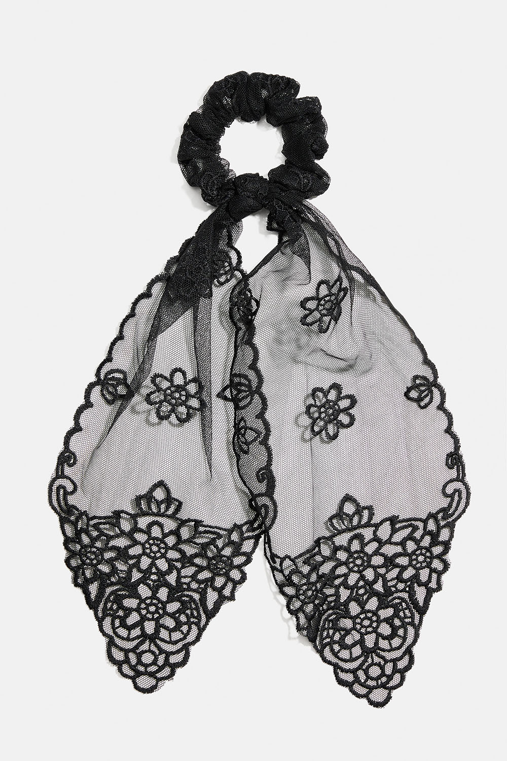 Scrunchie tail med sort blondestof. En fin detalje, der skaber en illusion af, at man har bundet et tørklæde om sin håropsætning.