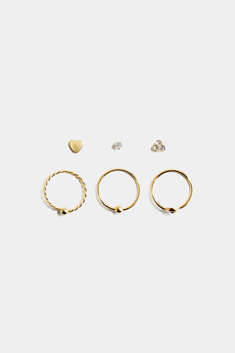 6 næsepiercinger i 18 karat guldbelagt sterlingsølv. Der er tre på en pind og tre stk. runde. Tre af piercingerne har små hvide glassten, en med hjerteform, en snoet og en traditionel med en lille kugle.