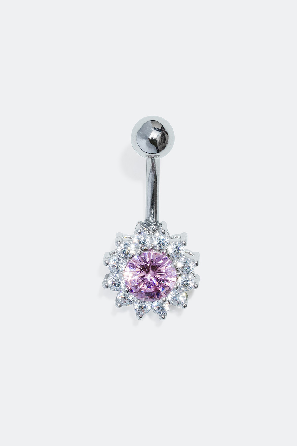 Navlepiercing med dekorativ blomst - Navlepiercing i kirurgisk stål med en dekoration formet som en blomst. Blomsten er udsmykket med krystalfarvede glassten i forskellige størrelser. Staven og kuglen er lavet i kirurgisk stål og vedhænget er i messing.