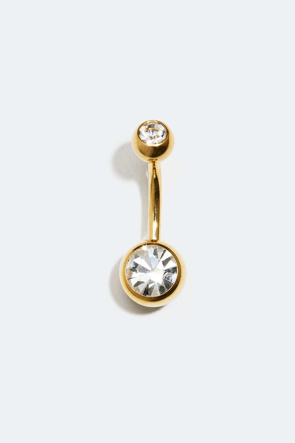 Klassisk navlepiercing i kirurgisk stål med glassten i begge kugler. Piercingen er uden vedhæng, hvilket mindsker risikoen for, at den hænger fast i tøjet. Et perfekt smykke til navlen, som kan bruges hver dag.